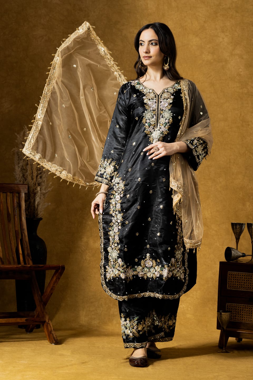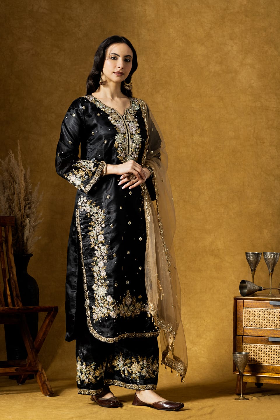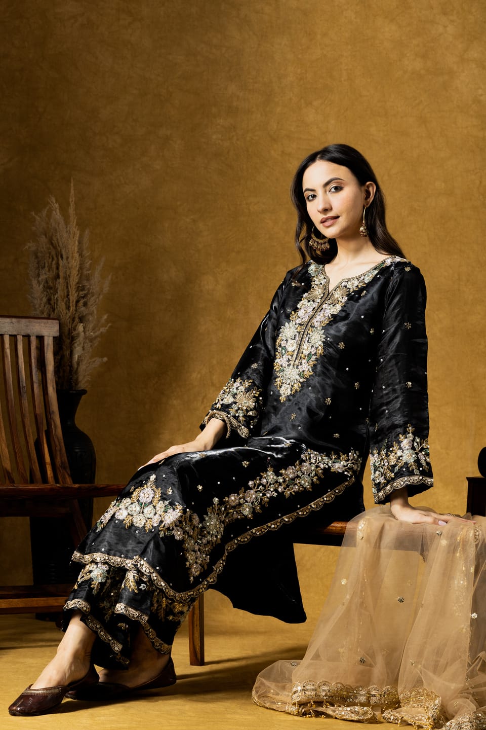 The calf-length straight kurta is adorned with intricate paisley embroidery highlighted with delicate sequins, creating a rich contrast against the classic black base. Paired with a coordinated plazo and a lightweight organza dupatta, the set offers effortless elegance and comfort.