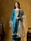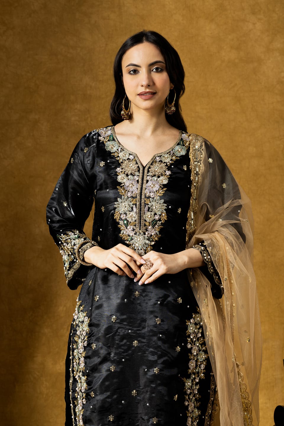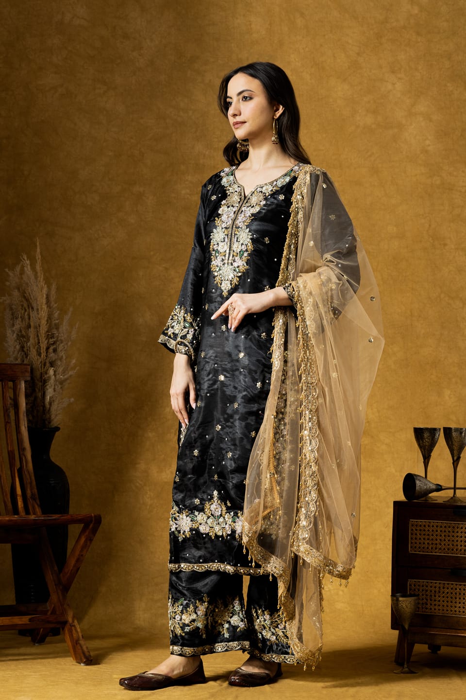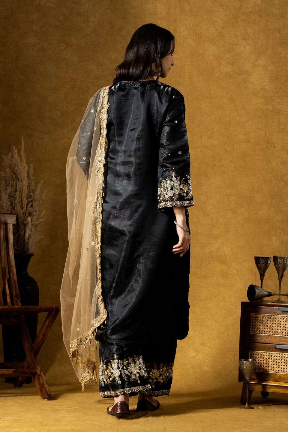 The calf-length straight kurta is adorned with intricate paisley embroidery highlighted with delicate sequins, creating a rich contrast against the classic black base. Paired with a coordinated plazo and a lightweight organza dupatta, the set offers effortless elegance and comfort.