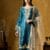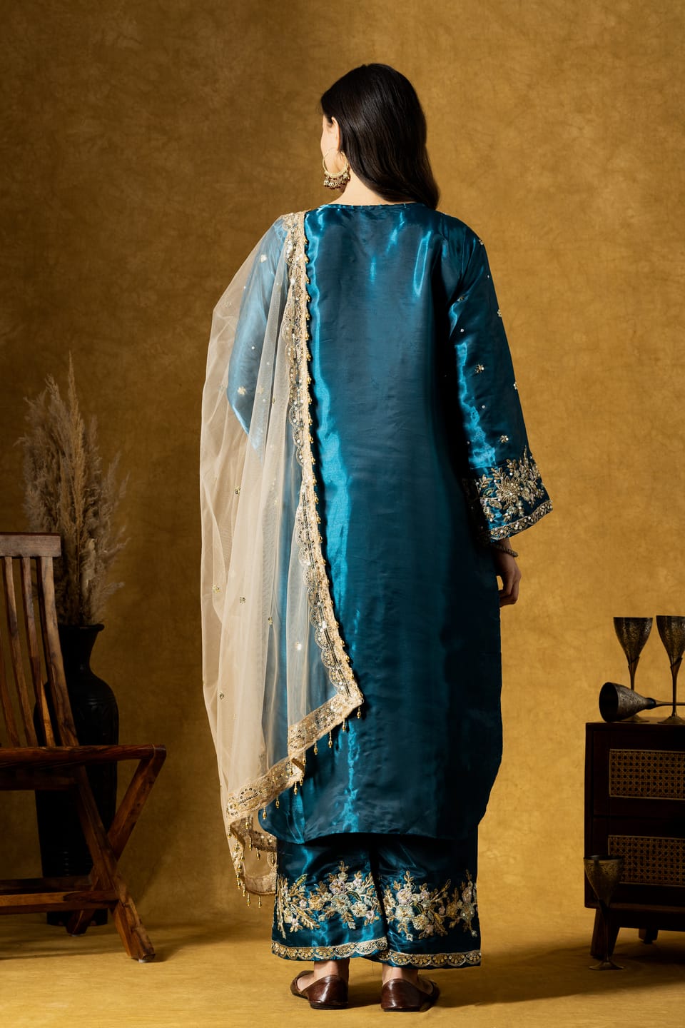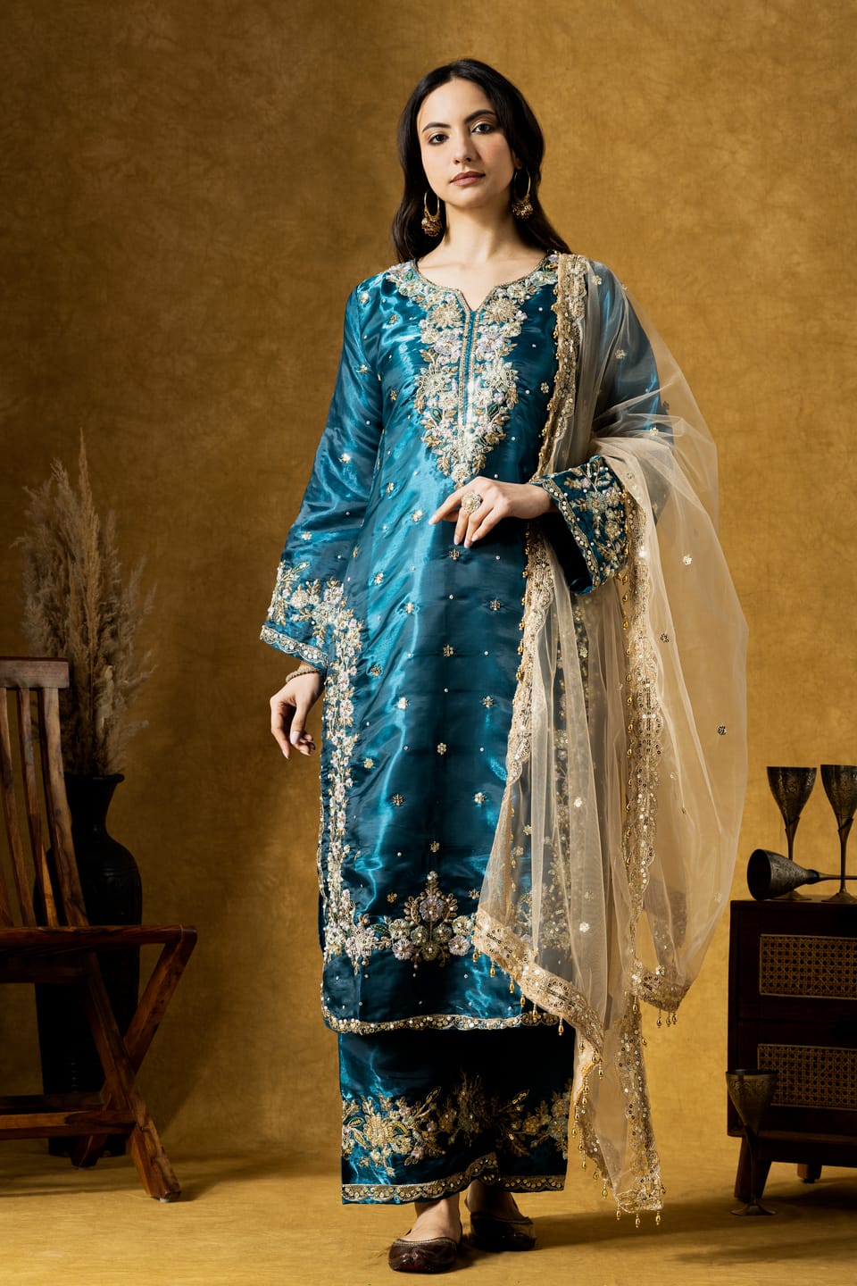 Elegant blue straight kurta set featuring paisley embroidery with subtle sequins, paired with matching plazo and a graceful organza dupatta—perfect for festive and party occasions.