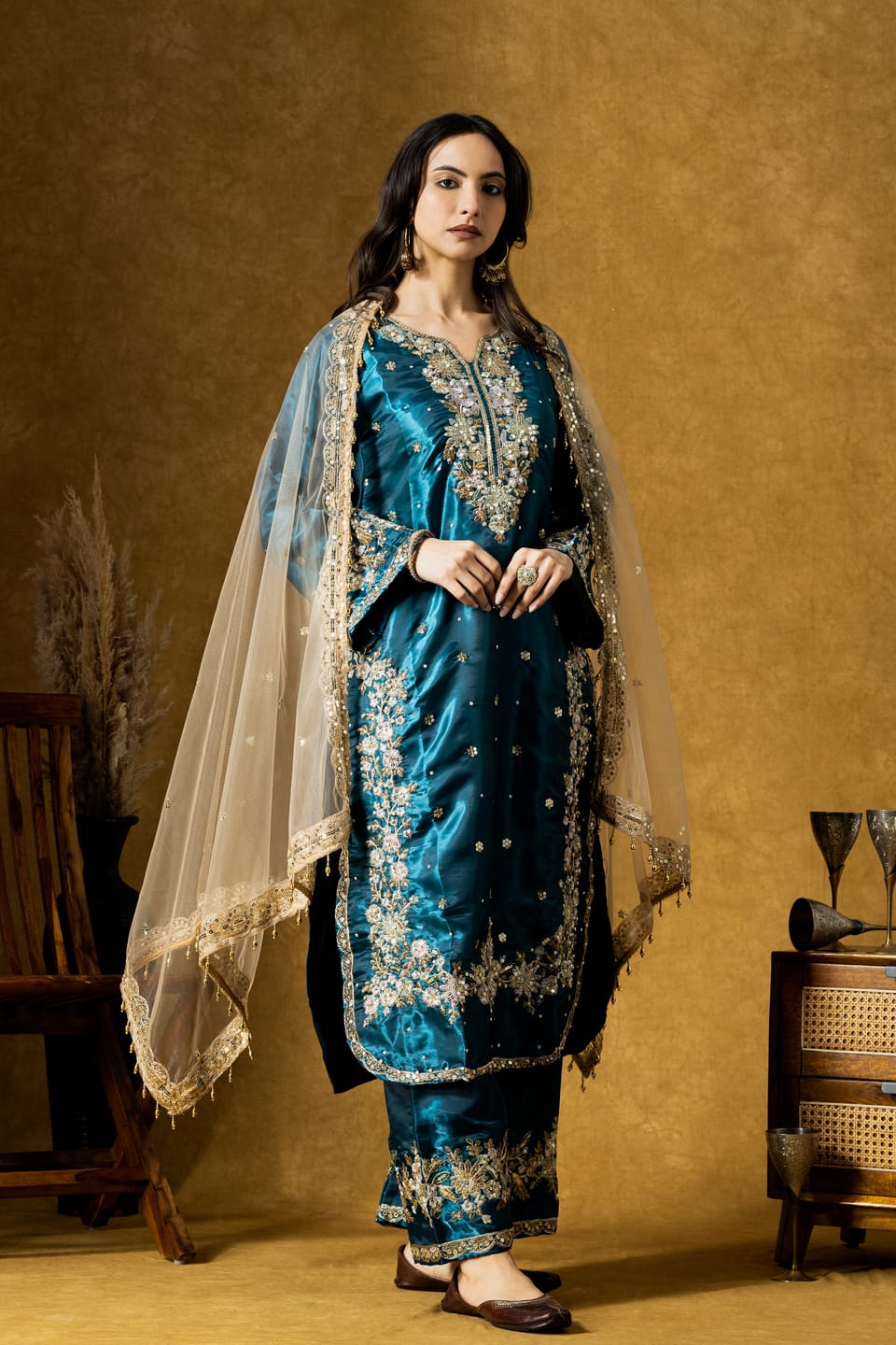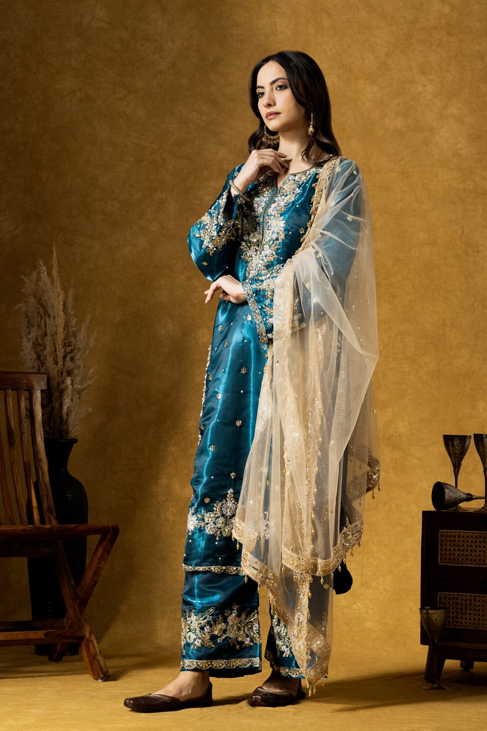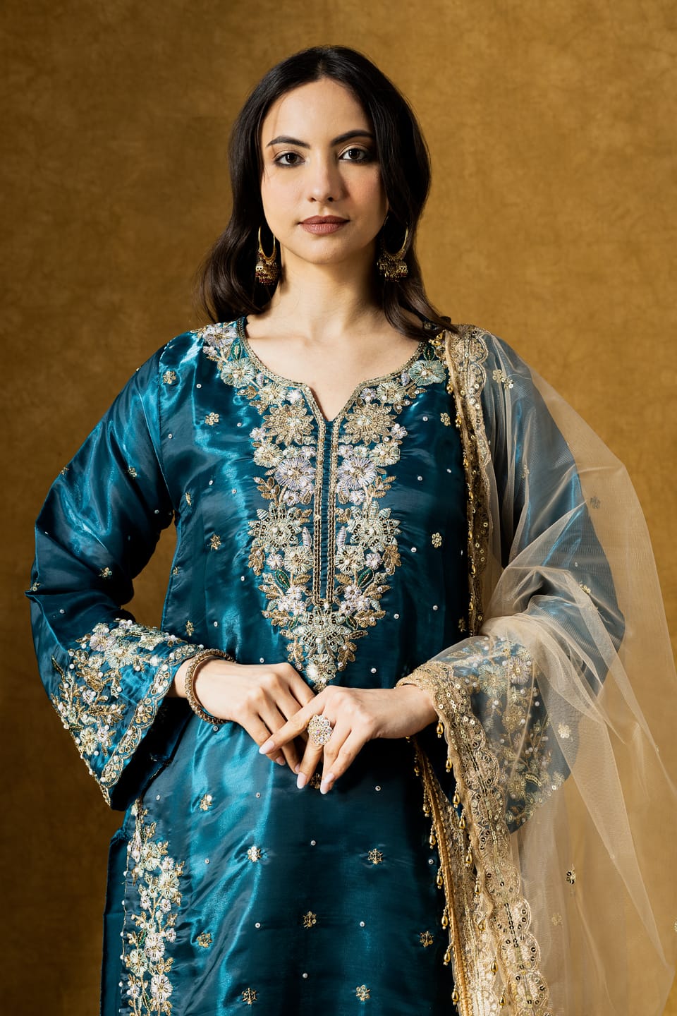 The calf-length straight kurta showcases detailed paisley embroidery enhanced with delicate sequins, creating a subtle festive shimmer. Paired with a coordinated plazo and a sheer organza dupatta, this set offers comfort, grace, and timeless style.