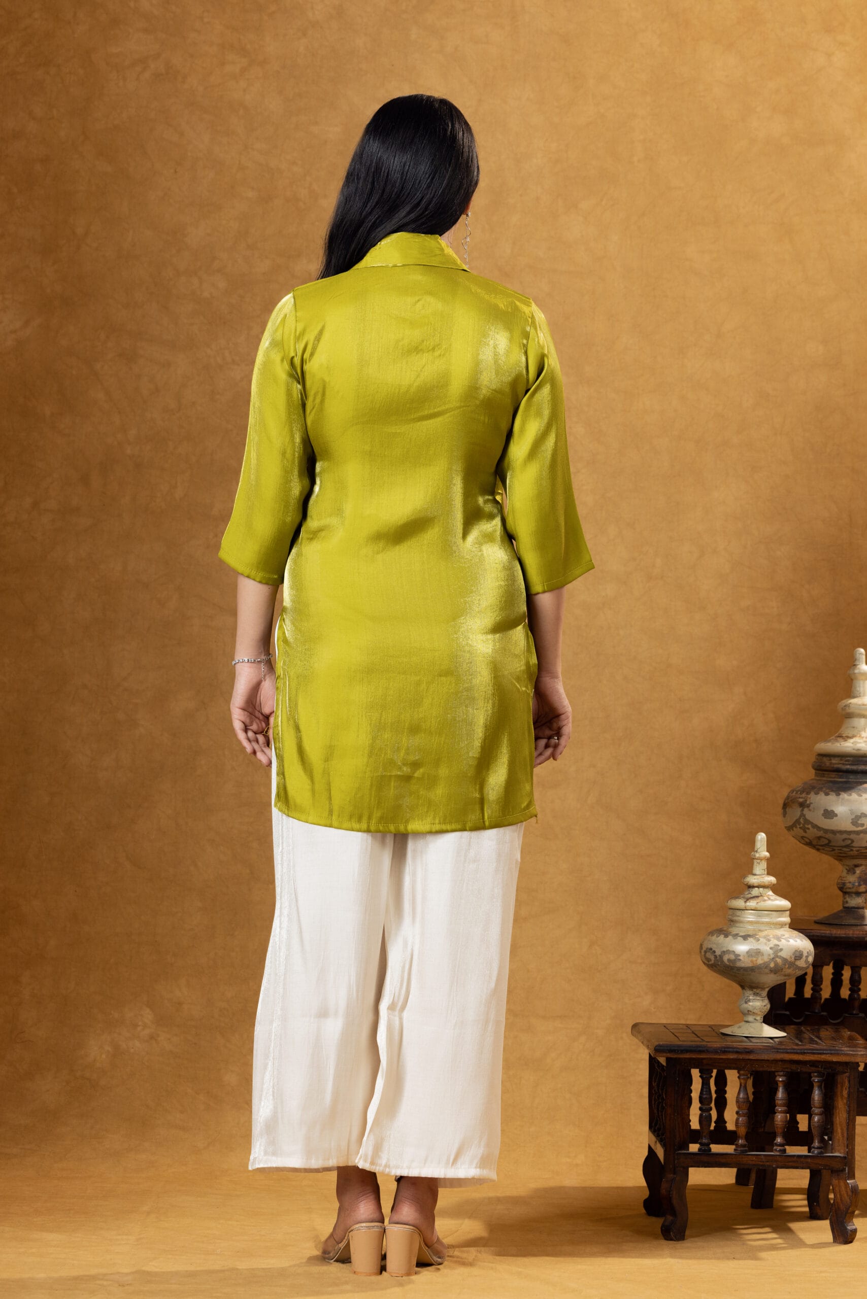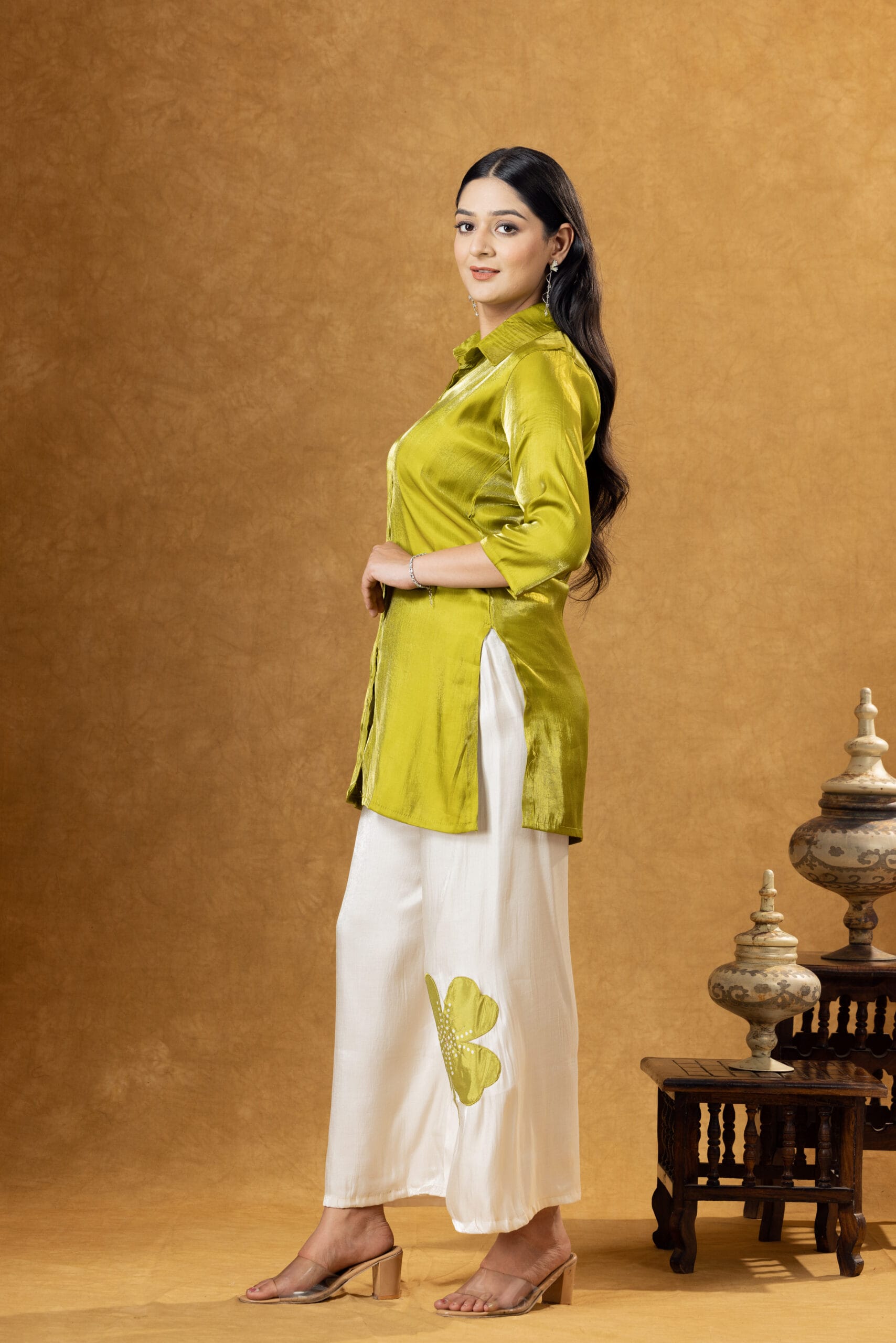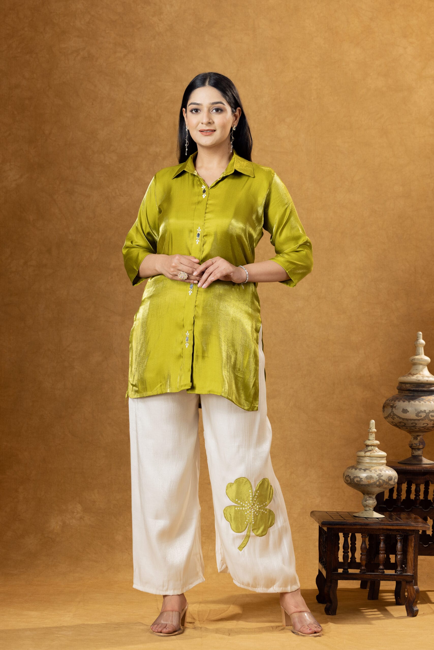 Elegant green Roman silk co-ord set featuring a stylish shirt paired with coordinated trousers. Designed for modern ethnic fashion with a luxurious and comfortable feel.