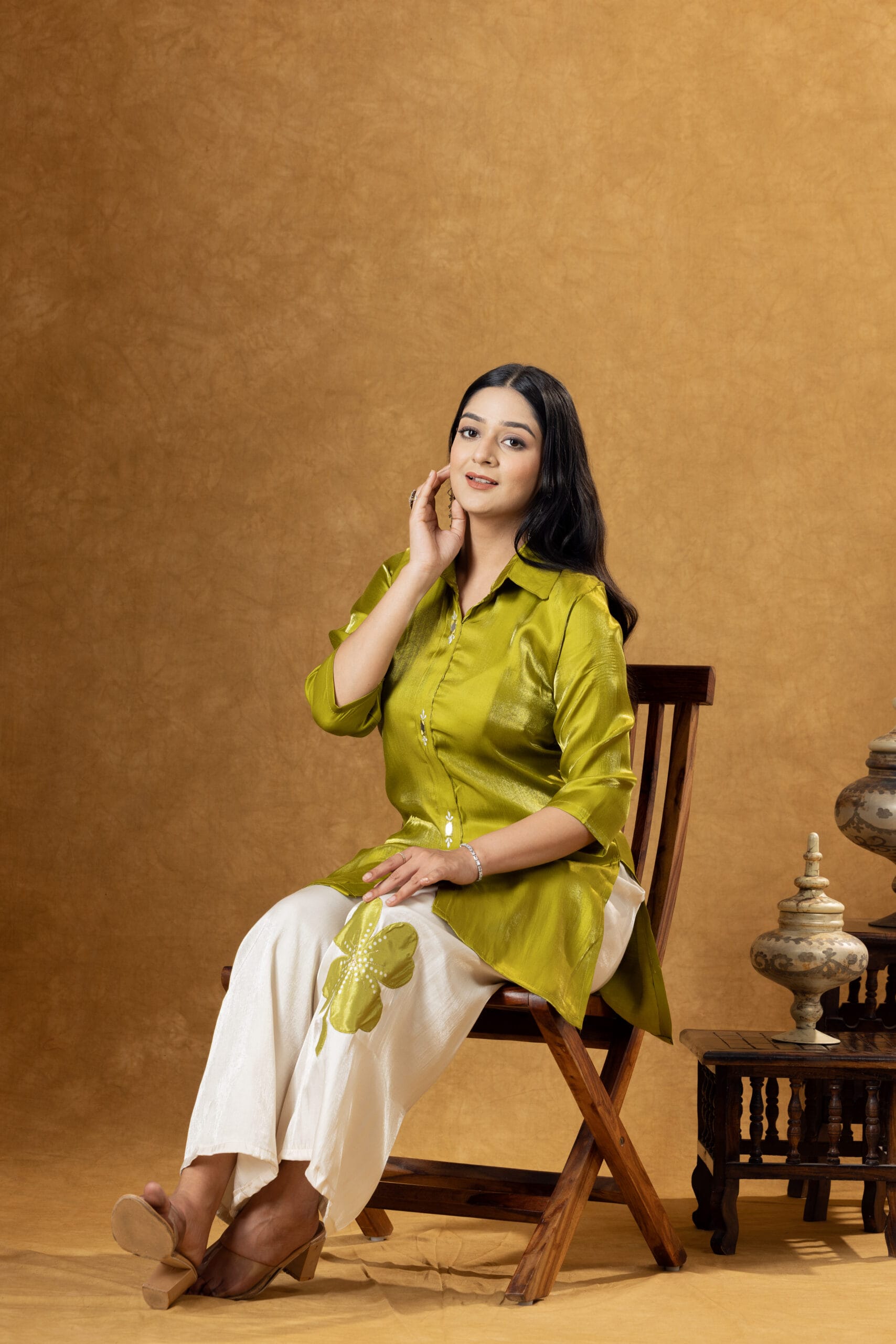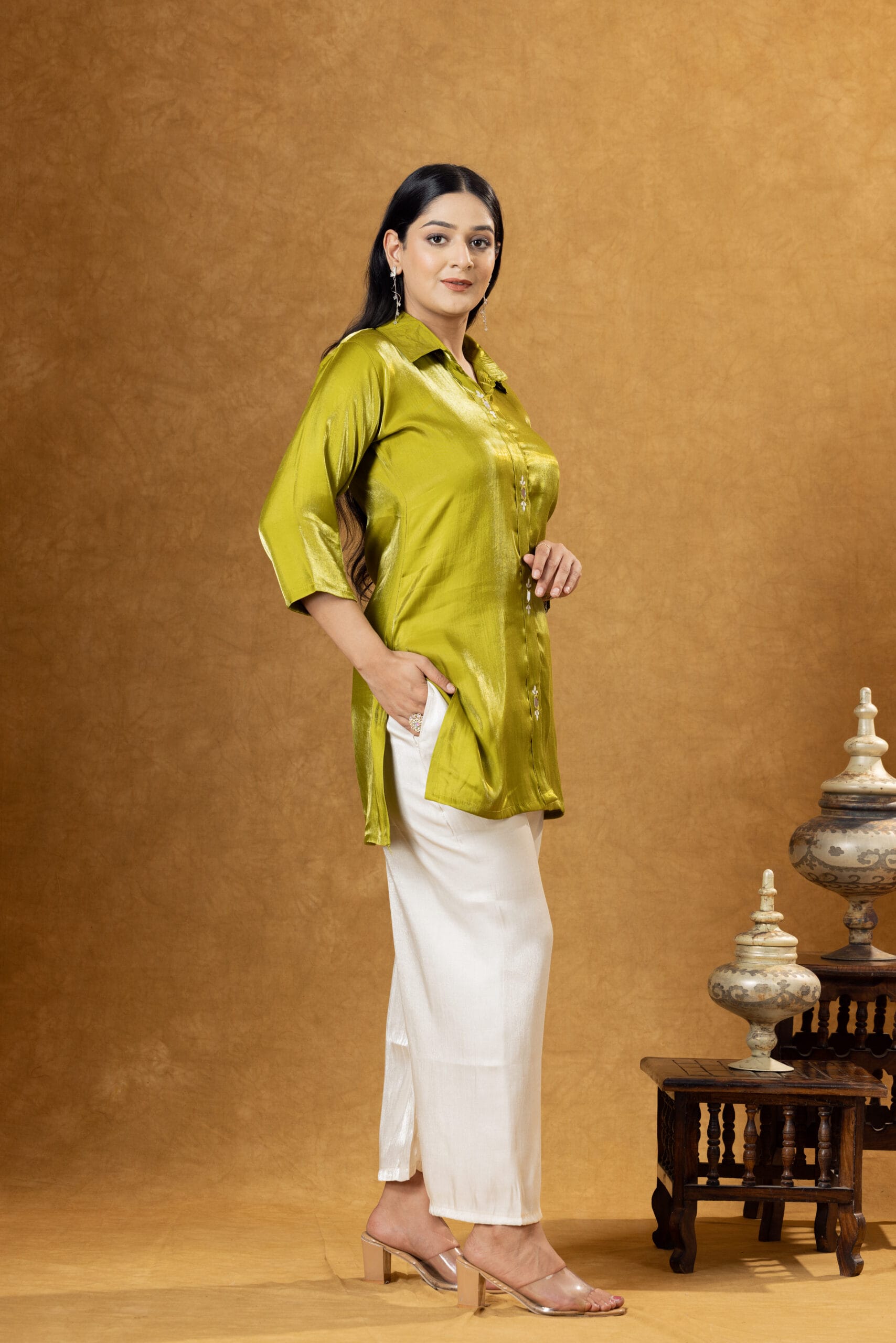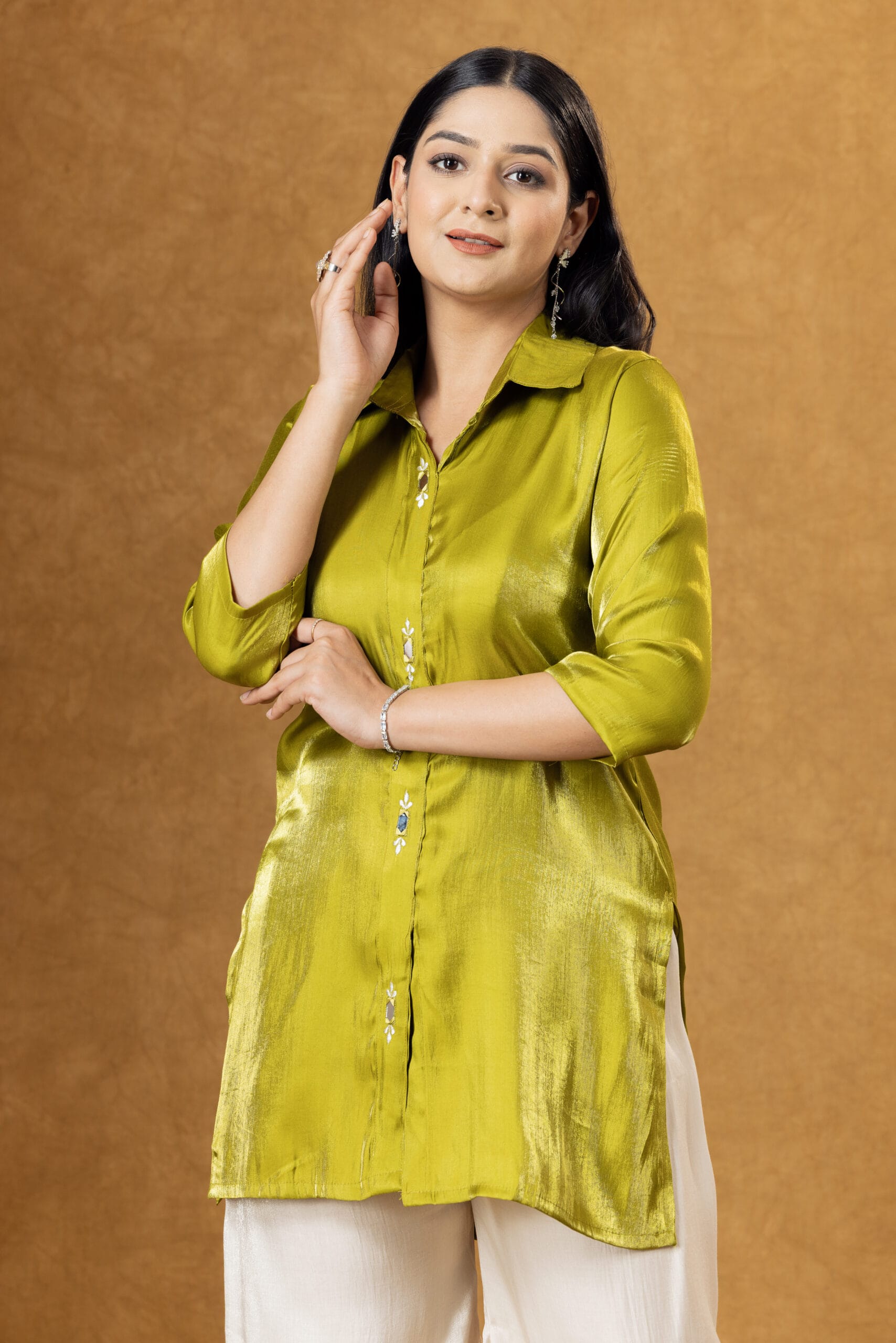 The shirt features a classic collared neckline with a sleek straight silhouette that adds a refined and contemporary touch. The matching Roman silk trousers complement the shirt beautifully and include delicate embroidered detailing that enhances the overall design.