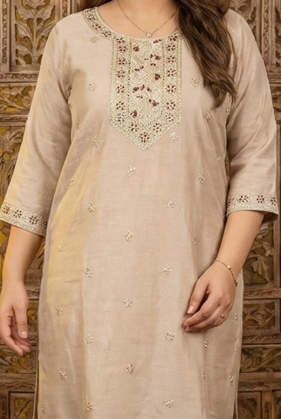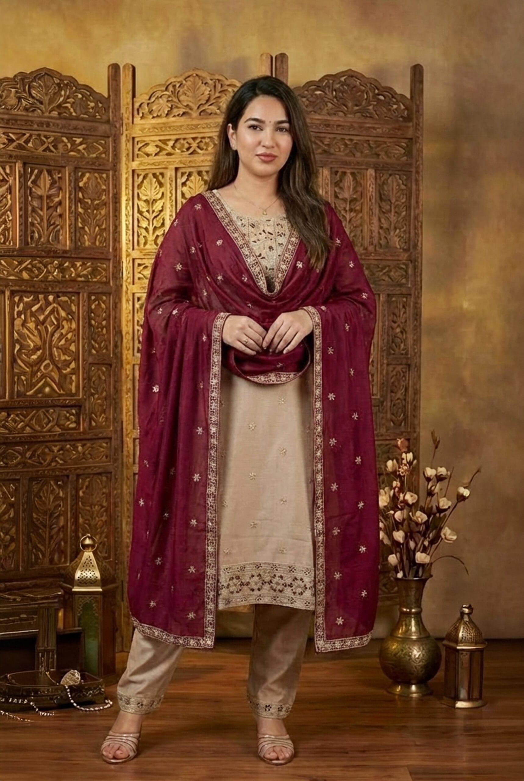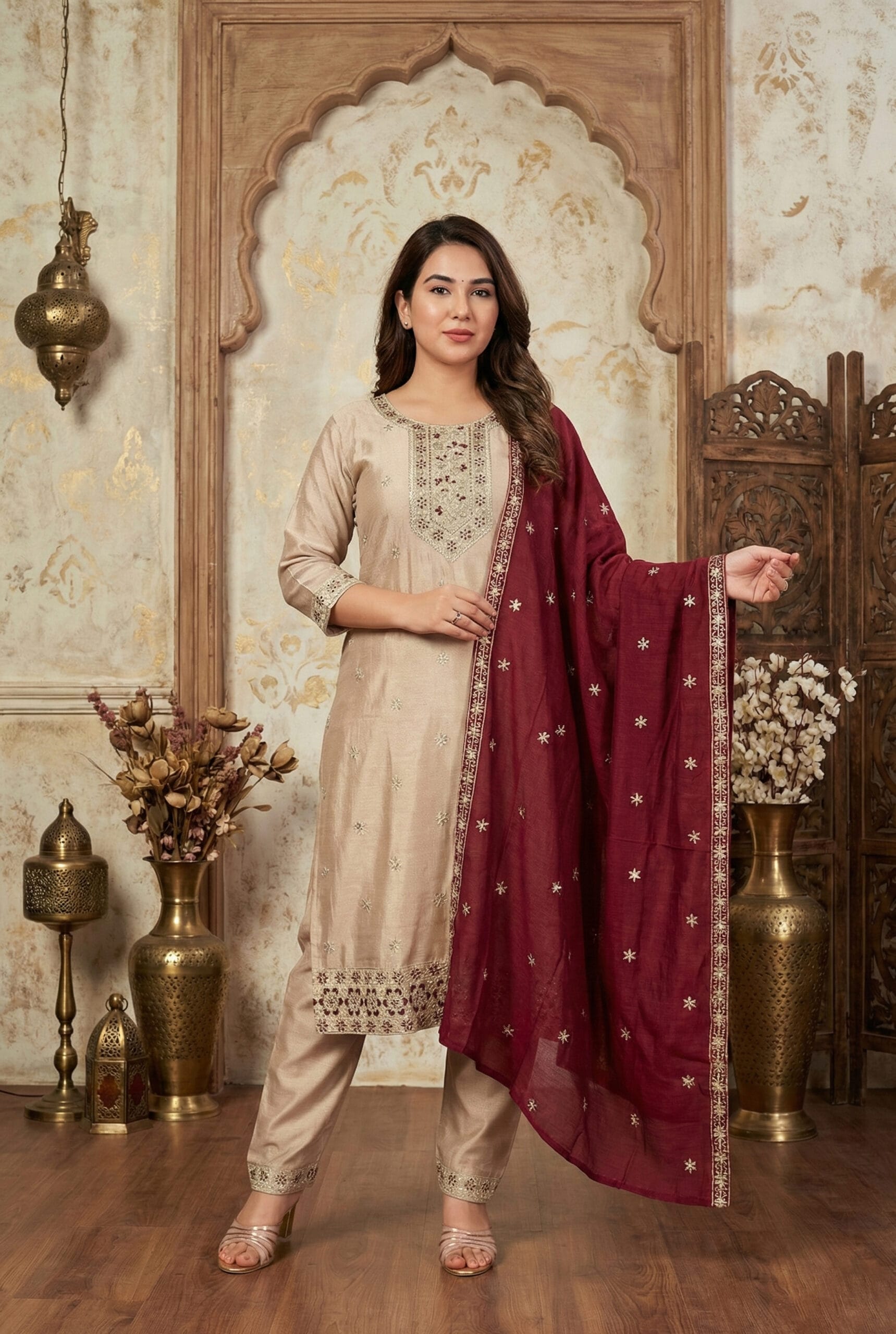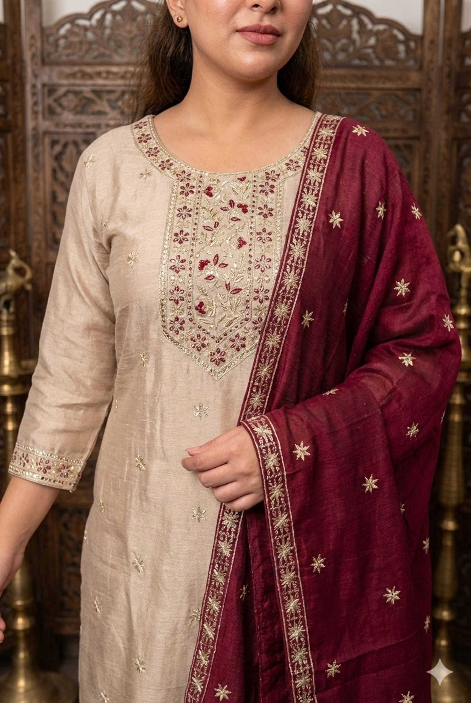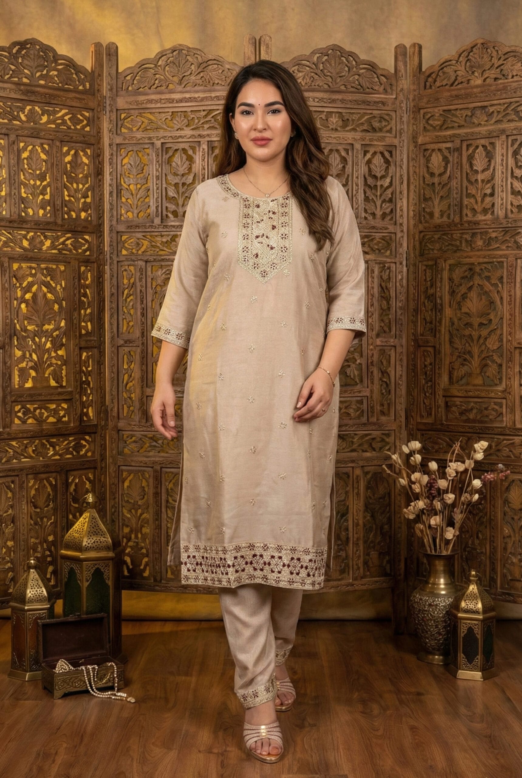 The set is paired with matching embroidered trousers and a luxurious maroon silk blend dupatta, adorned with elegant motifs and a detailed border. Ideal for festive occasions, celebrations, and elegant evening gatherings, this kurta set blends traditional craftsmanship with timeless sophistication.