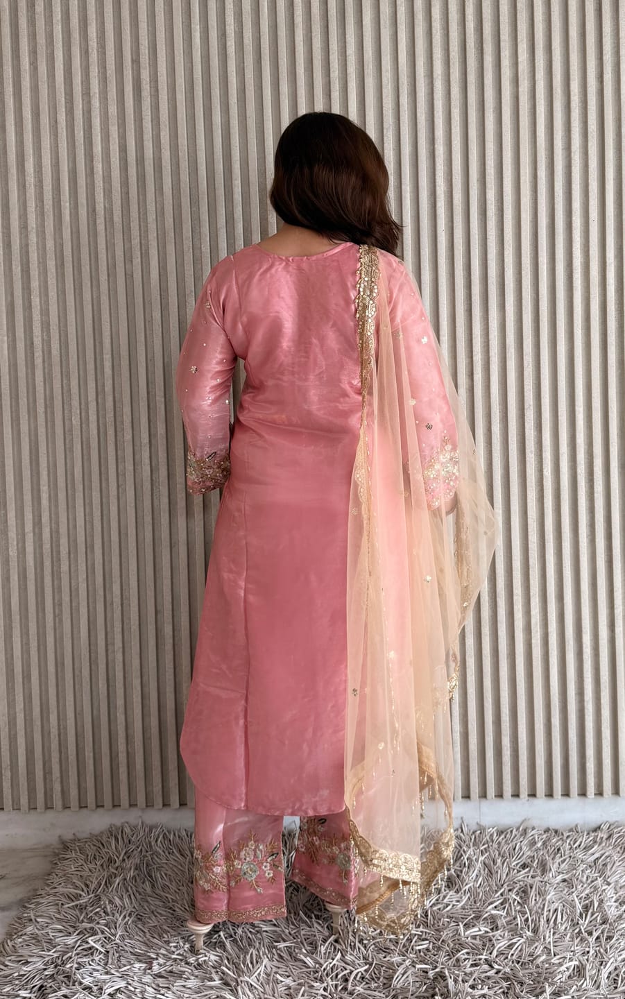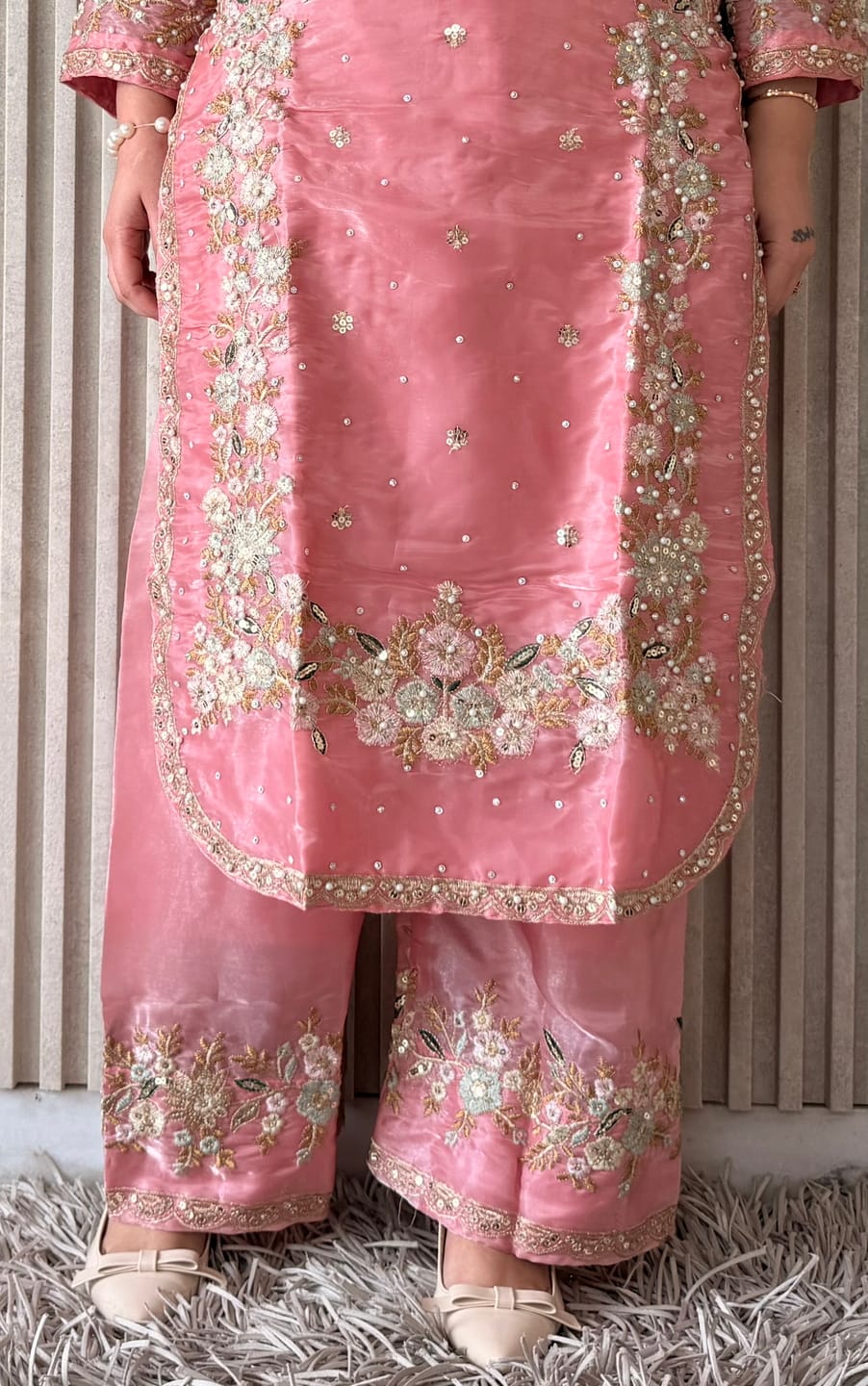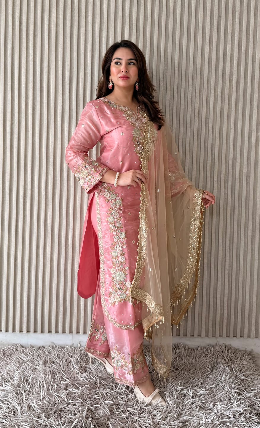 Soft peach straight kurta set featuring paisley embroidery and sequins, paired with matching plazo and an elegant organza dupatta.