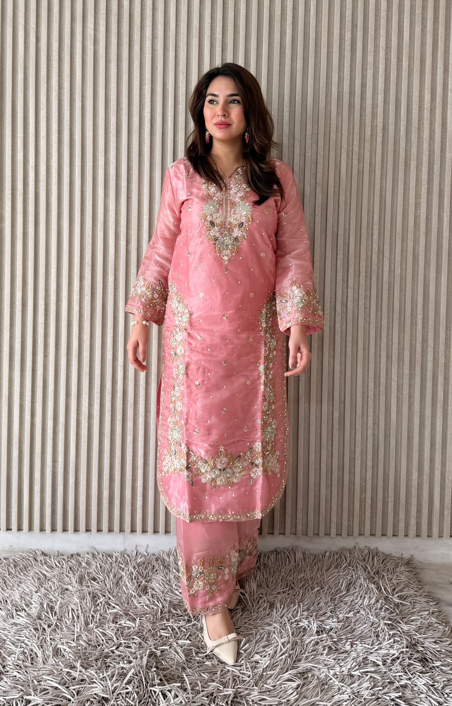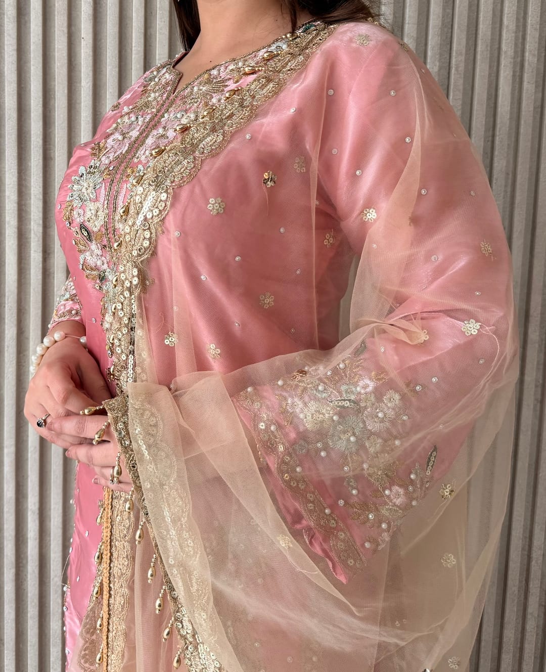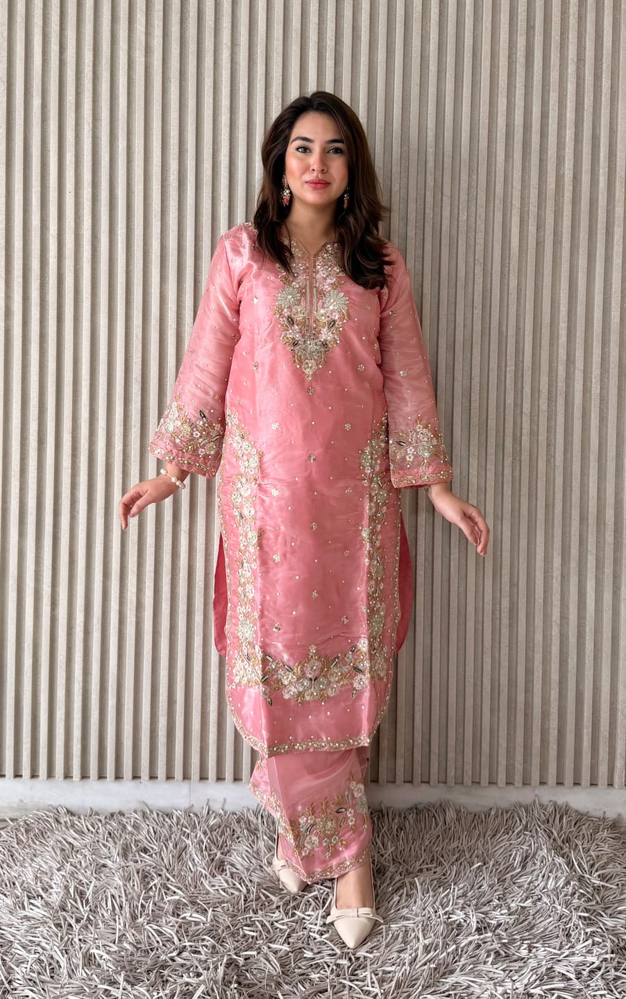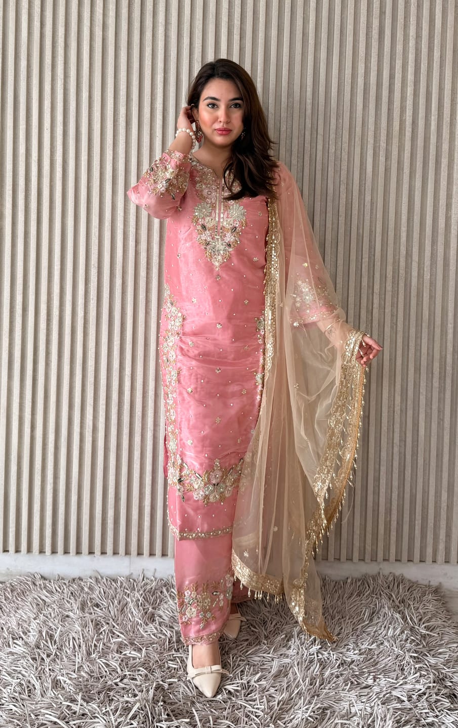 Soft peach straight kurta set featuring paisley embroidery and sequins, paired with matching plazo and an elegant organza dupatta.