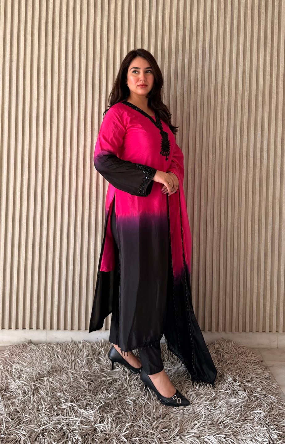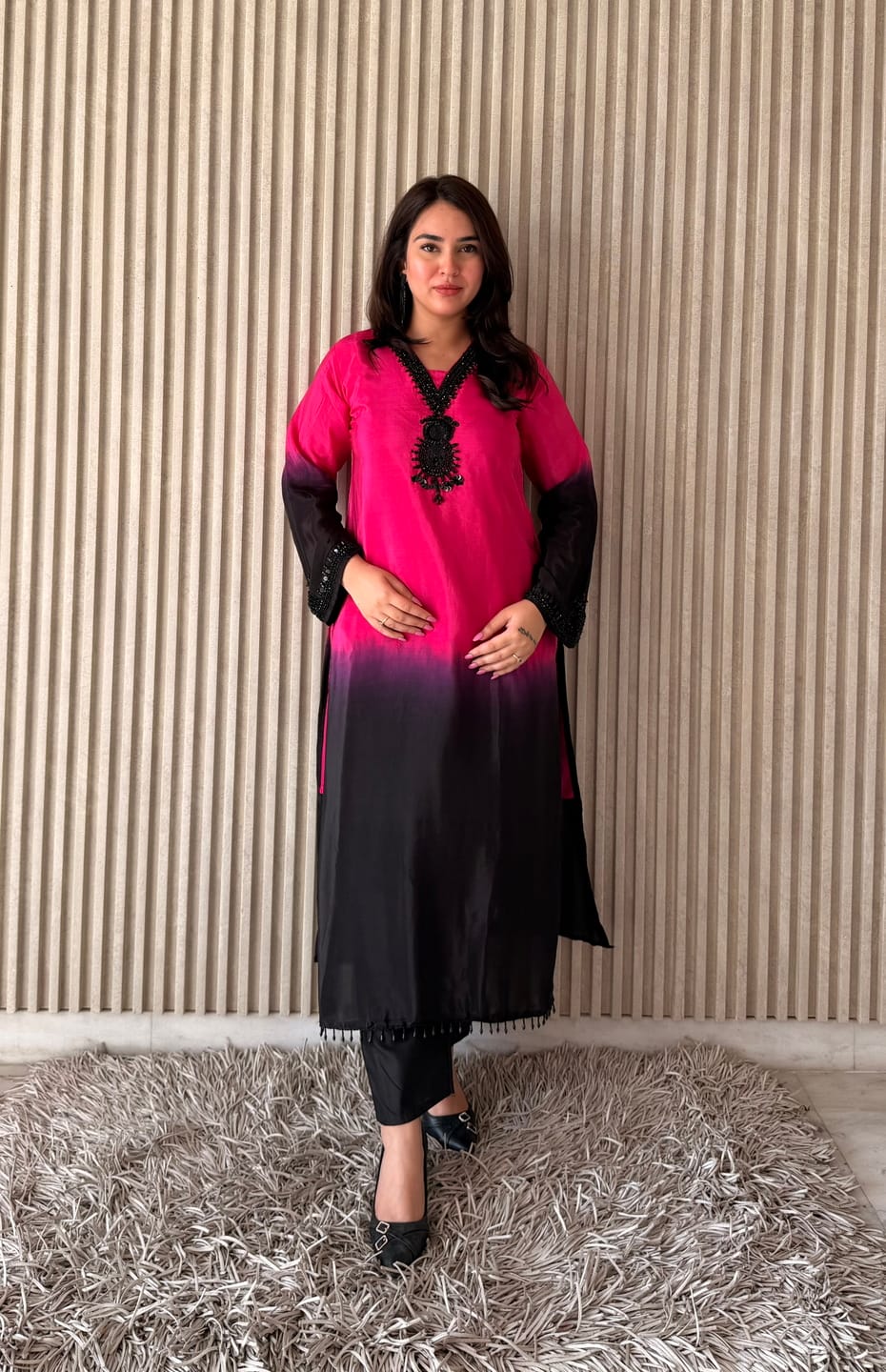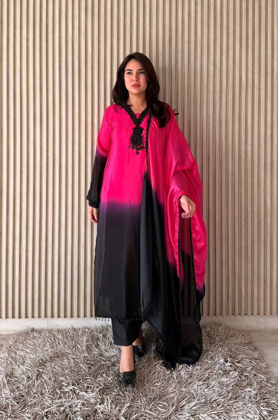 The kurta features a beautiful ombre-style transition from vibrant pink to deep black, enhanced with intricate embroidery detailing around the neckline. The V-neck design and full sleeves add a modern yet graceful touch. Paired with matching straight-fit muslin pants and a coordinated dupatta, this ensemble creates a complete and polished ethnic look.