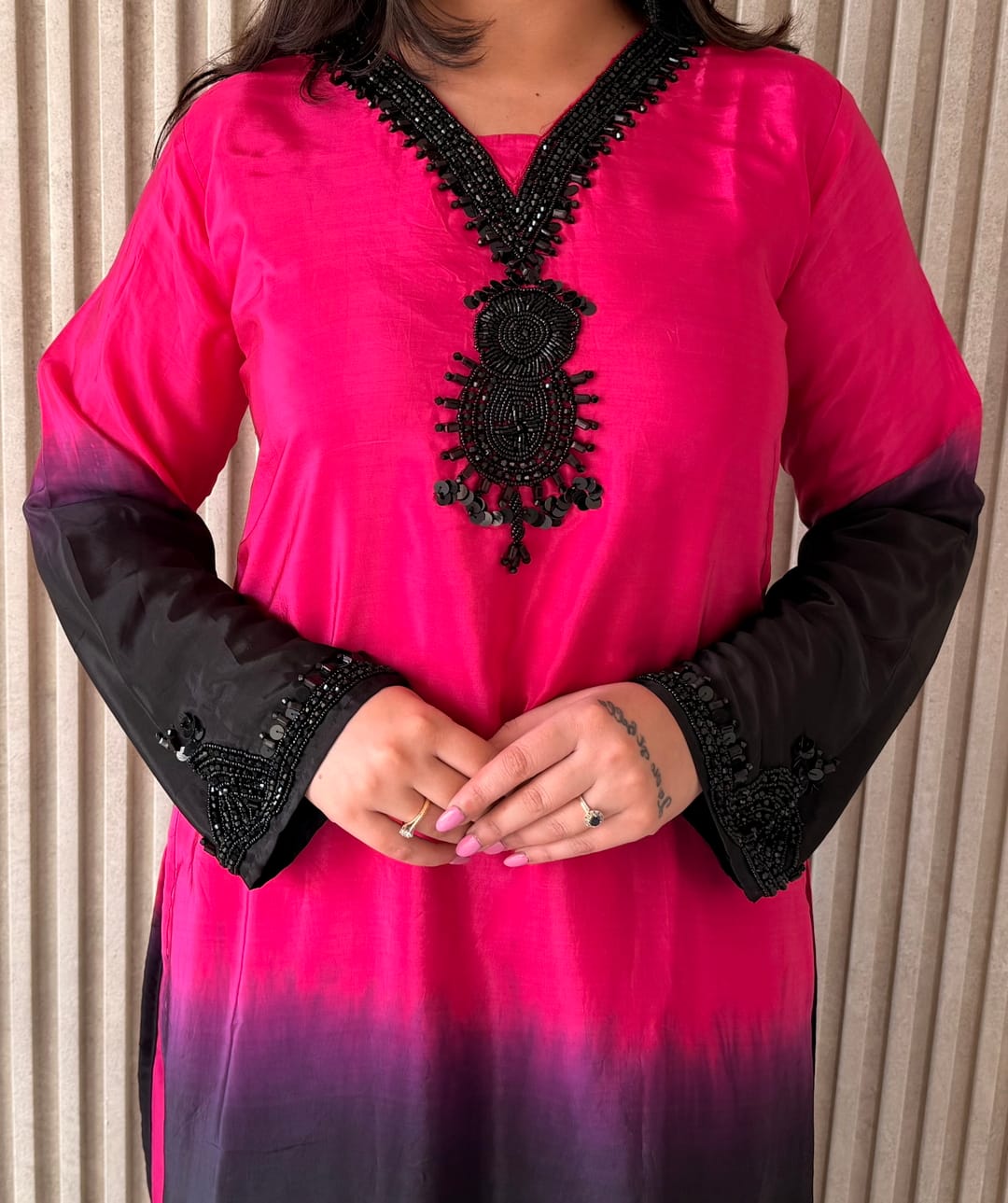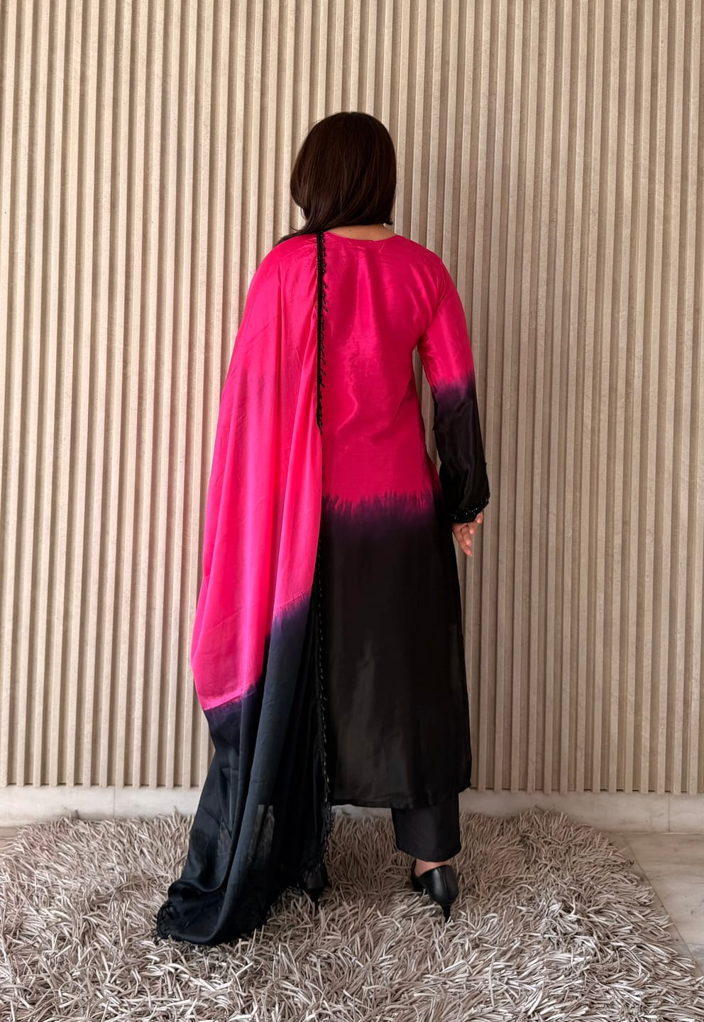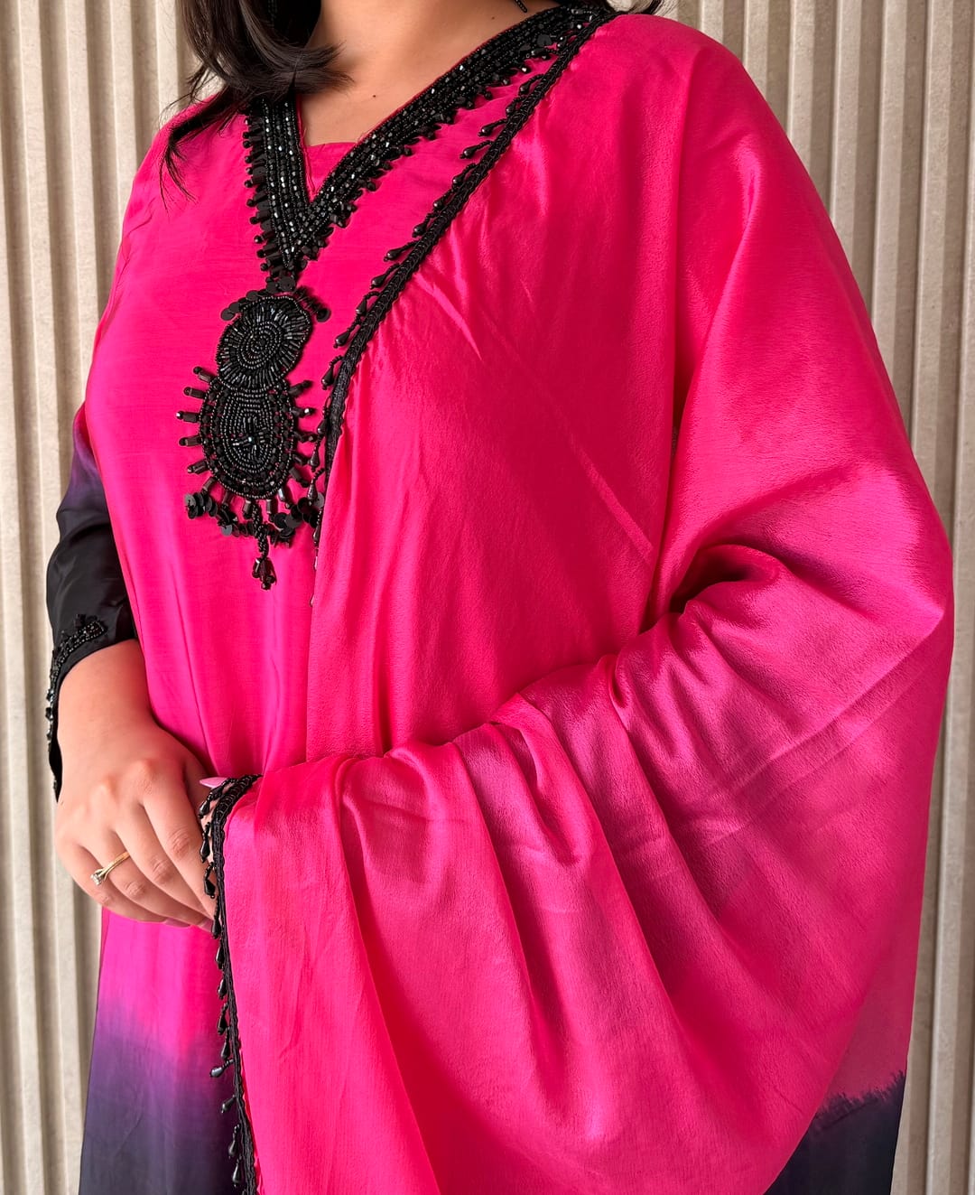 The kurta features a beautiful ombre-style transition from vibrant pink to deep black, enhanced with intricate embroidery detailing around the neckline. The V-neck design and full sleeves add a modern yet graceful touch. Paired with matching straight-fit muslin pants and a coordinated dupatta, this ensemble creates a complete and polished ethnic look.