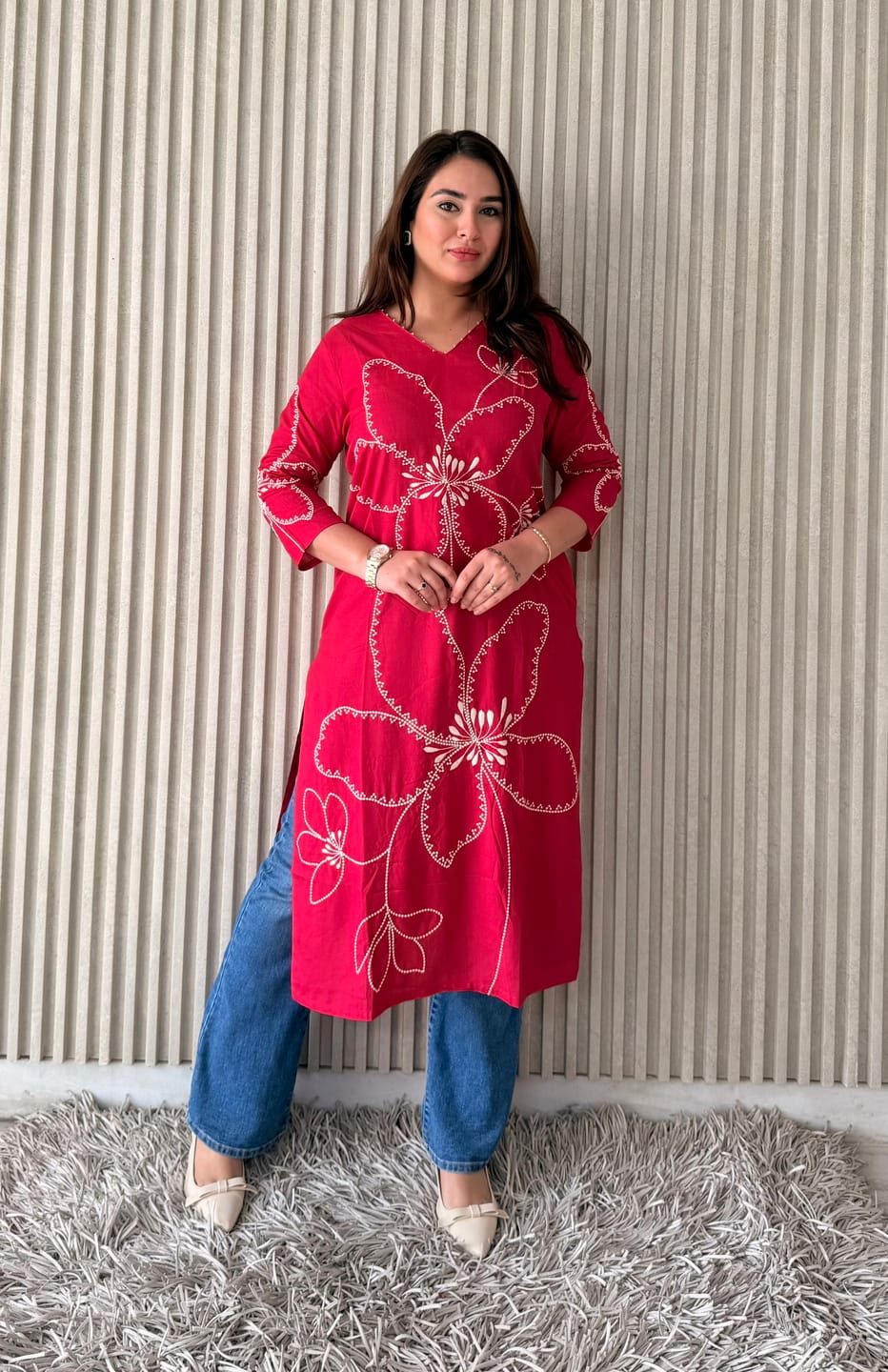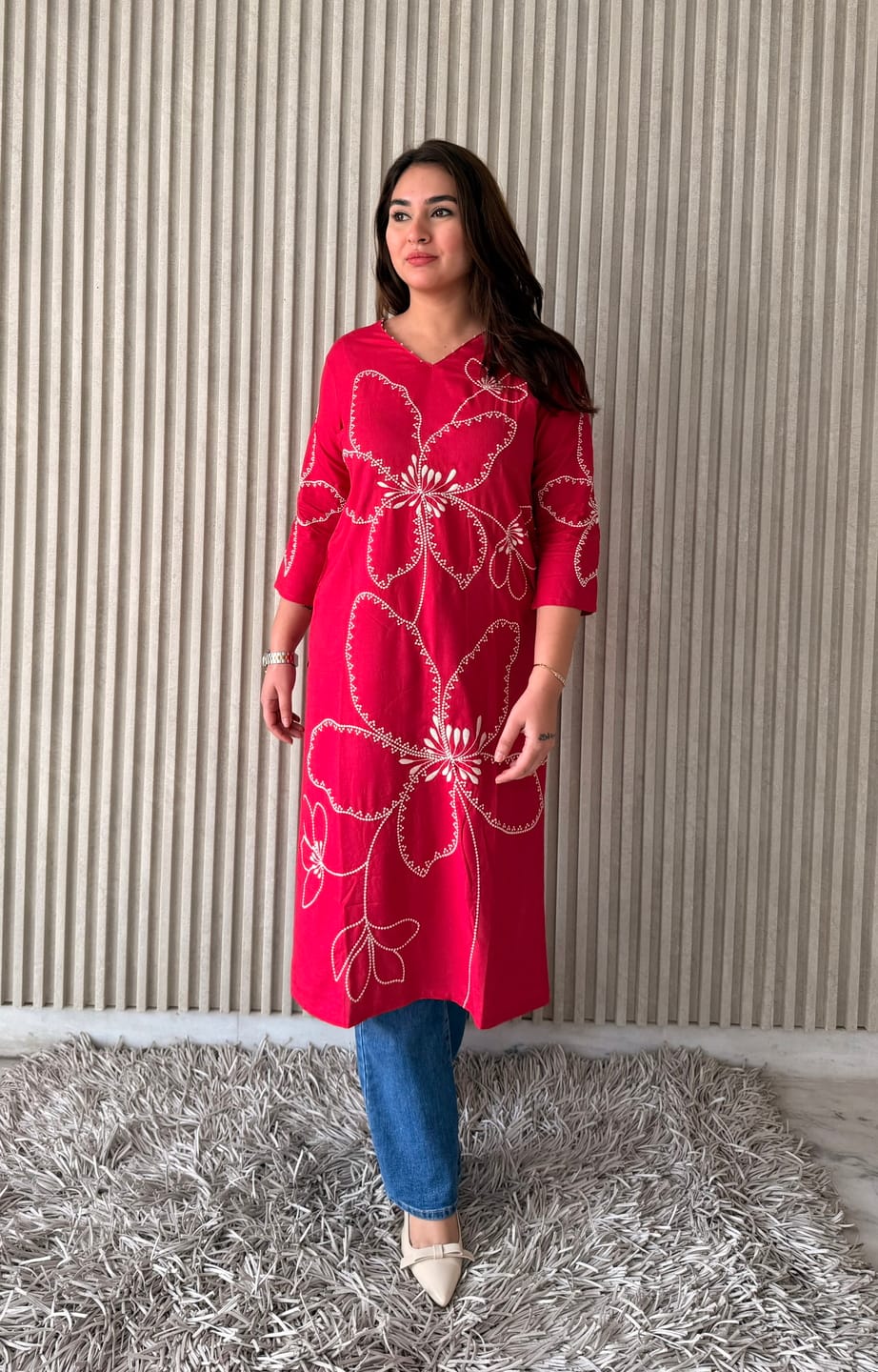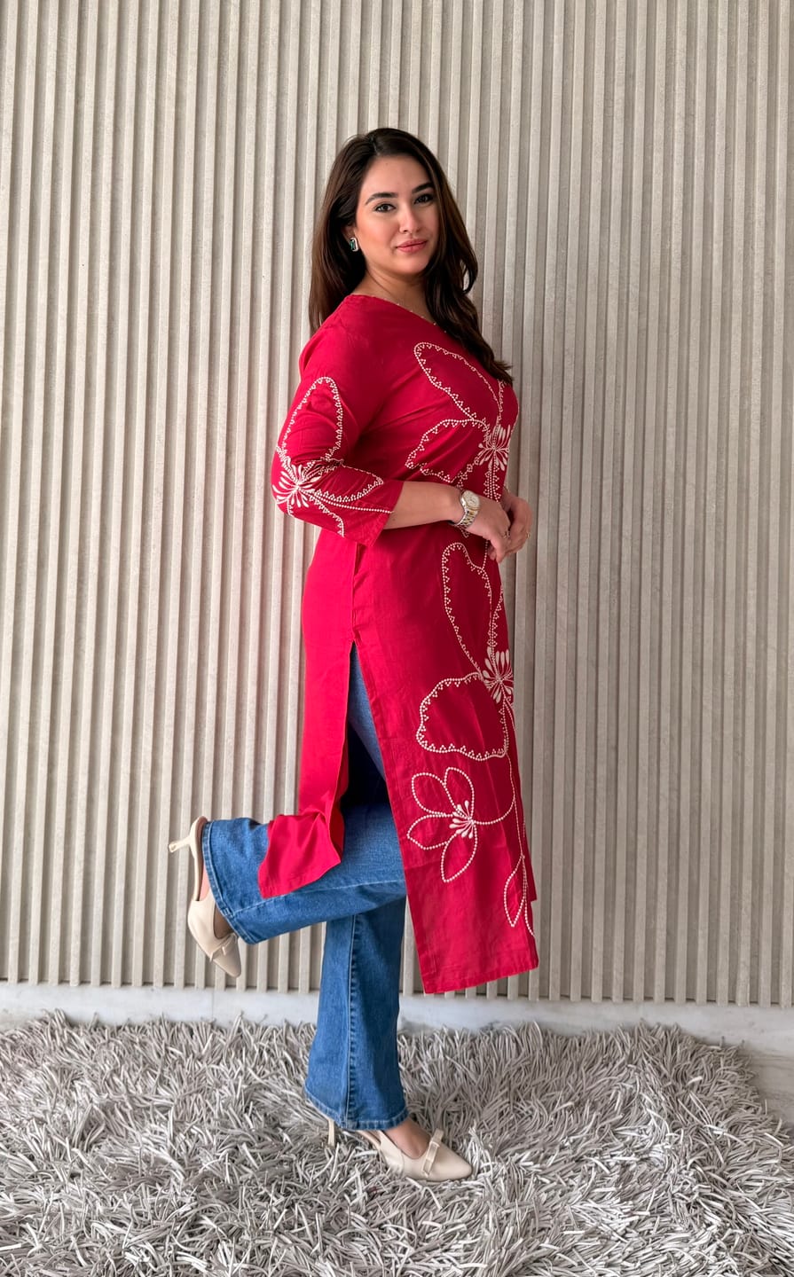 Designed with a classic V-neckline and 3/4th sleeves, the kurti features beautiful ethnic motif thread embroidery in a bold floral pattern that stands out effortlessly. The calf-length straight silhouette ensures a flattering and easy-to-style fit, making it perfect to pair with jeans, palazzos, or trousers.