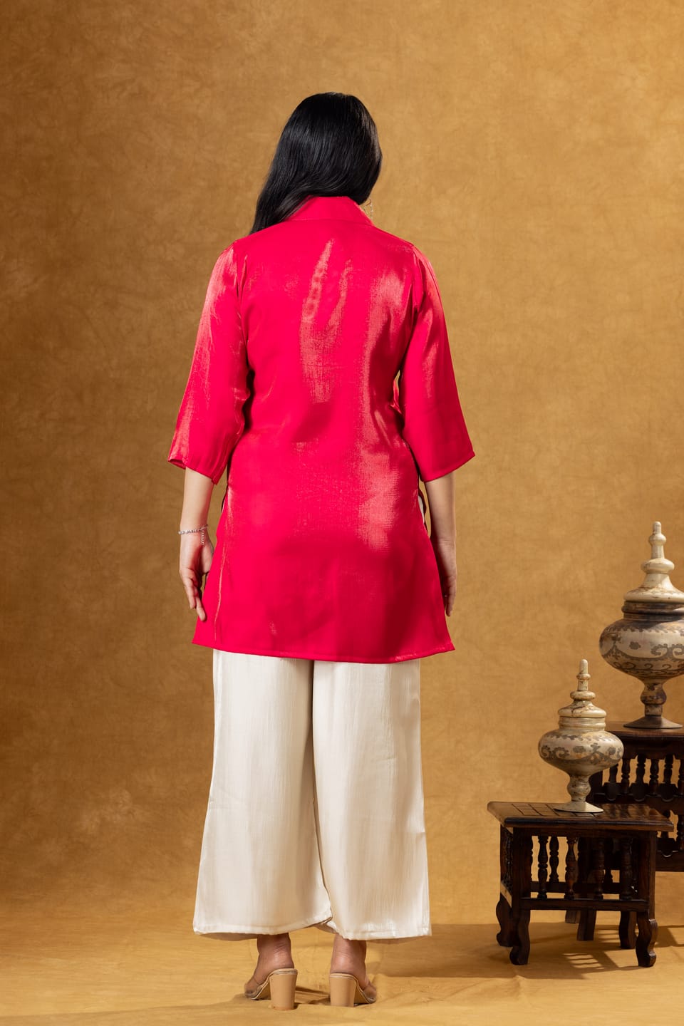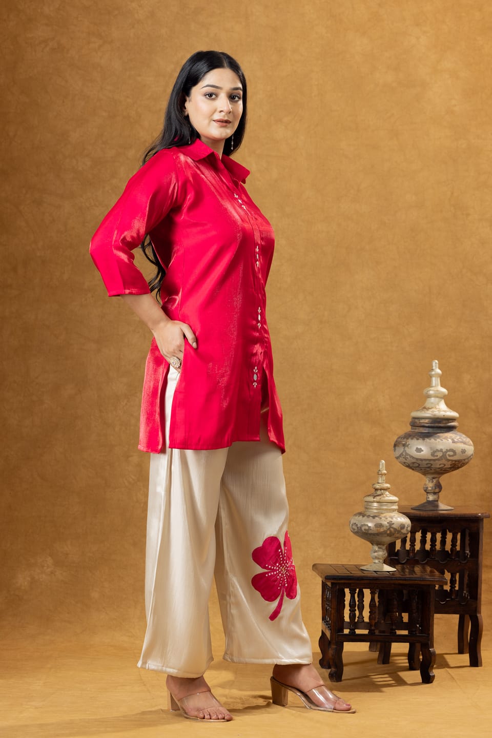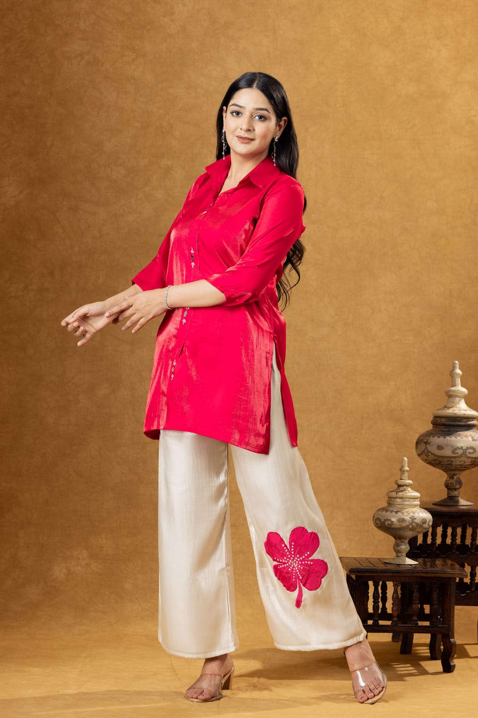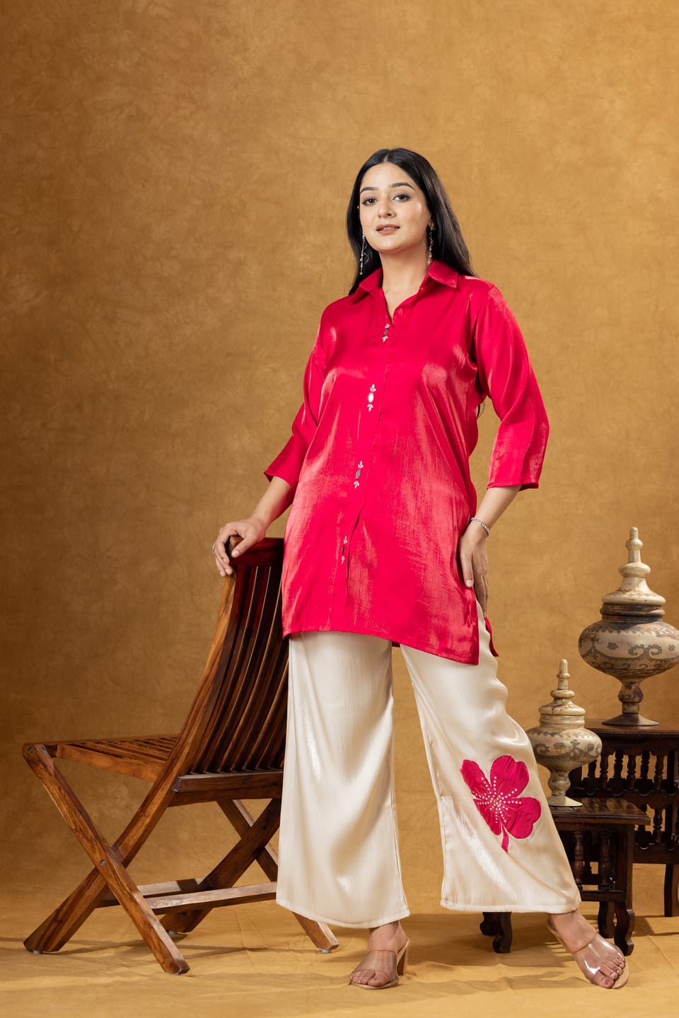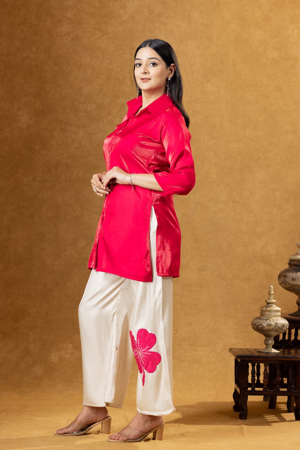 Stylish pink Roman silk co-ord set featuring a modern shirt paired with coordinated trousers. Designed for comfort and elegance, perfect for casual outings and contemporary ethnic wear.