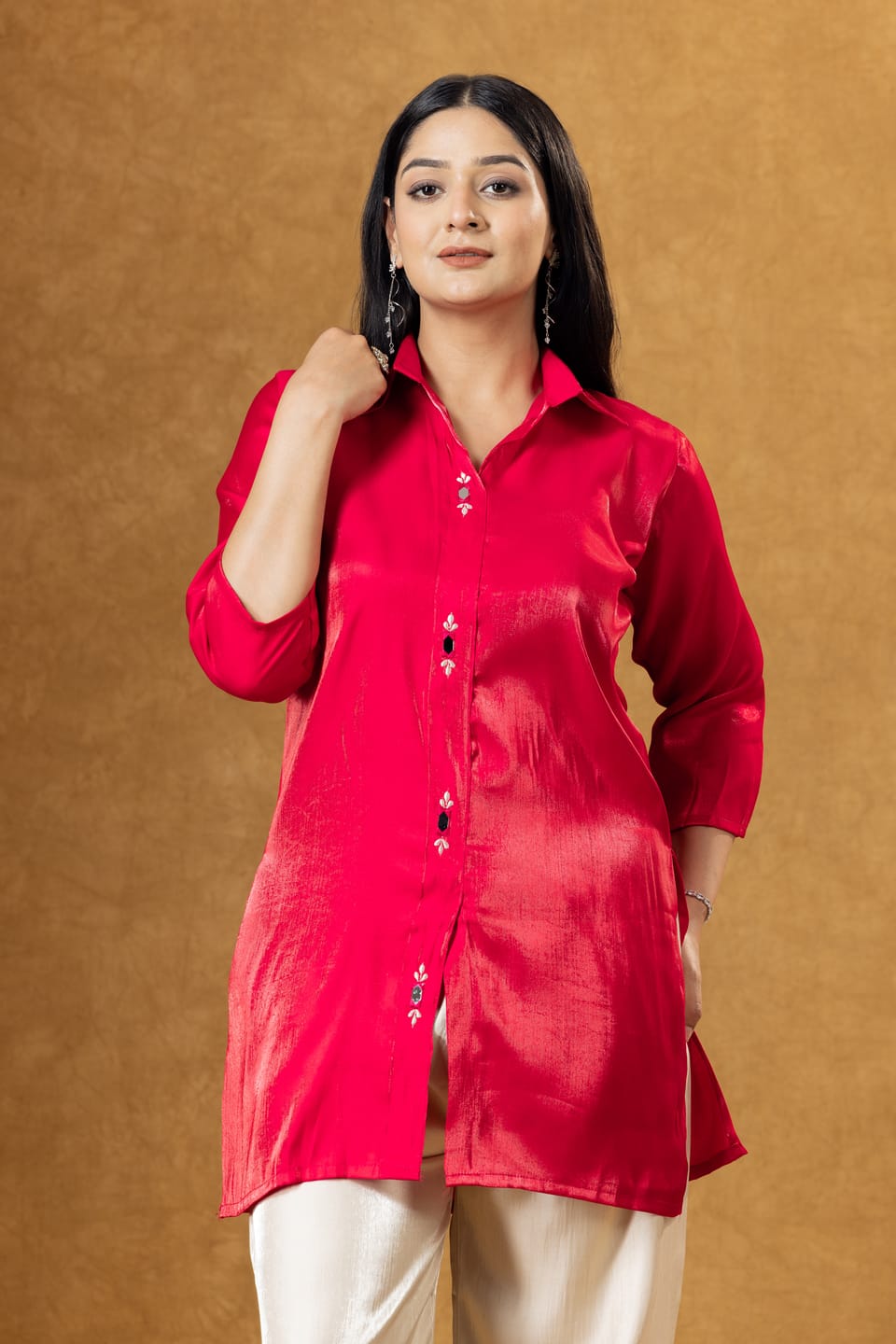 The shirt features a collared neckline and a straight silhouette that gives it a modern and sophisticated appeal. Paired with matching Roman silk trousers adorned with subtle embroidered detailing, this coordinated set creates a balanced and refined look.