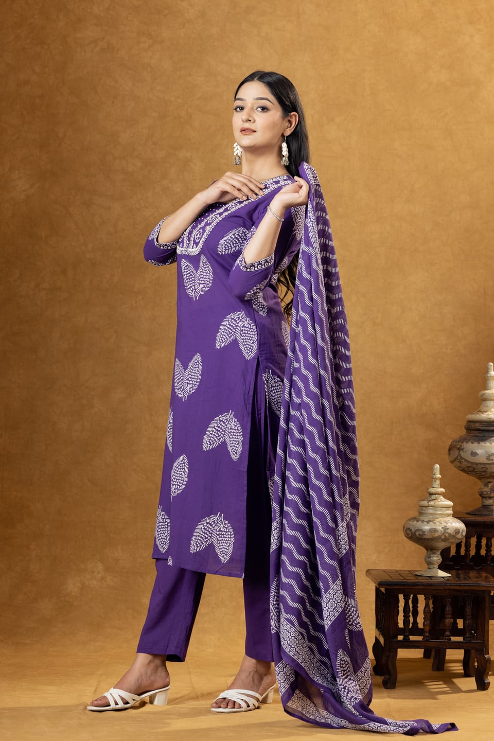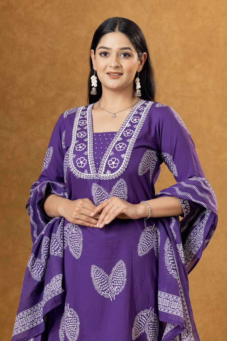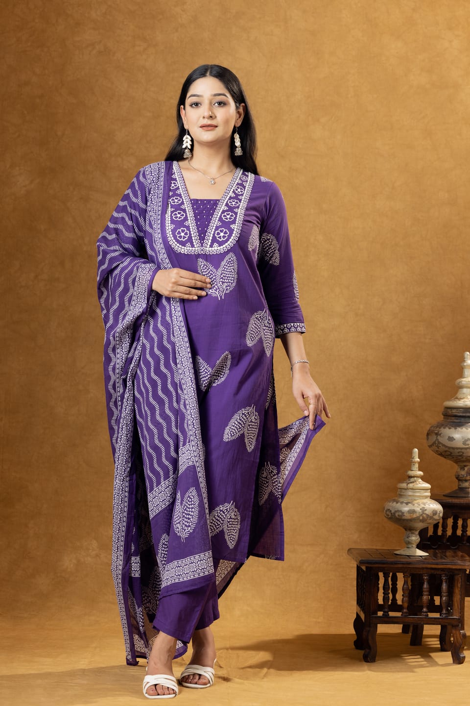 Elegant purple cotton kurta set featuring ethnic motifs print, comfortable palazzo pants, and a coordinated dupatta. Perfect for casual ethnic wear and everyday comfort.
