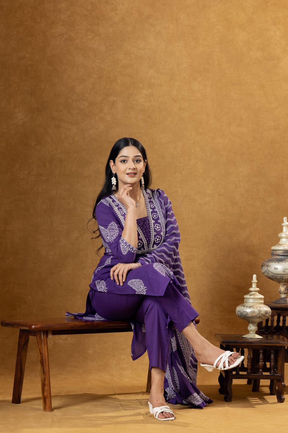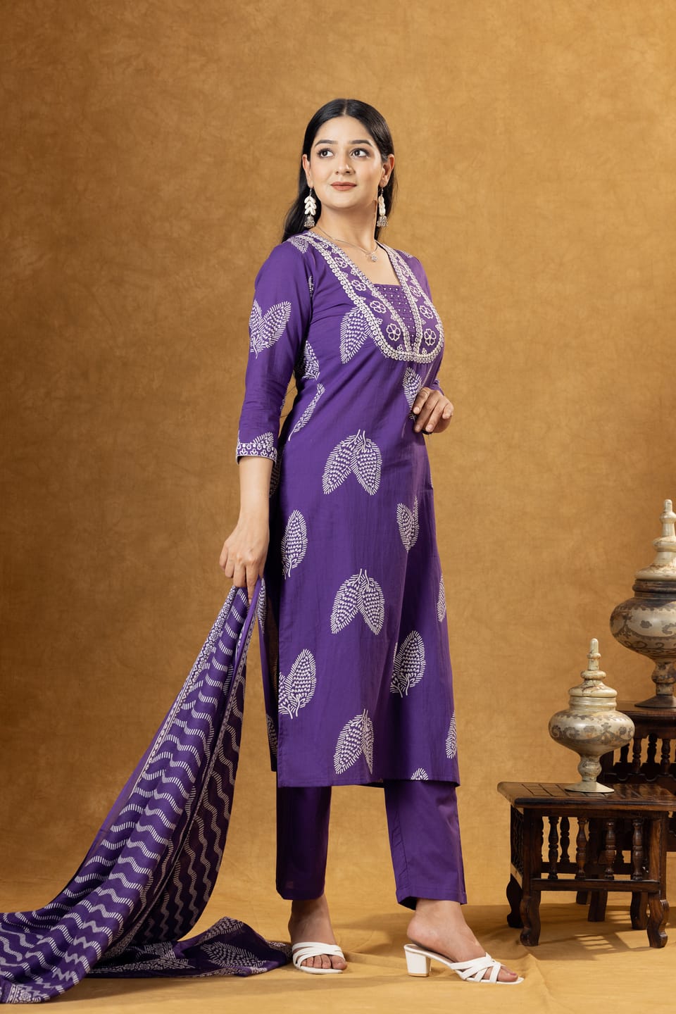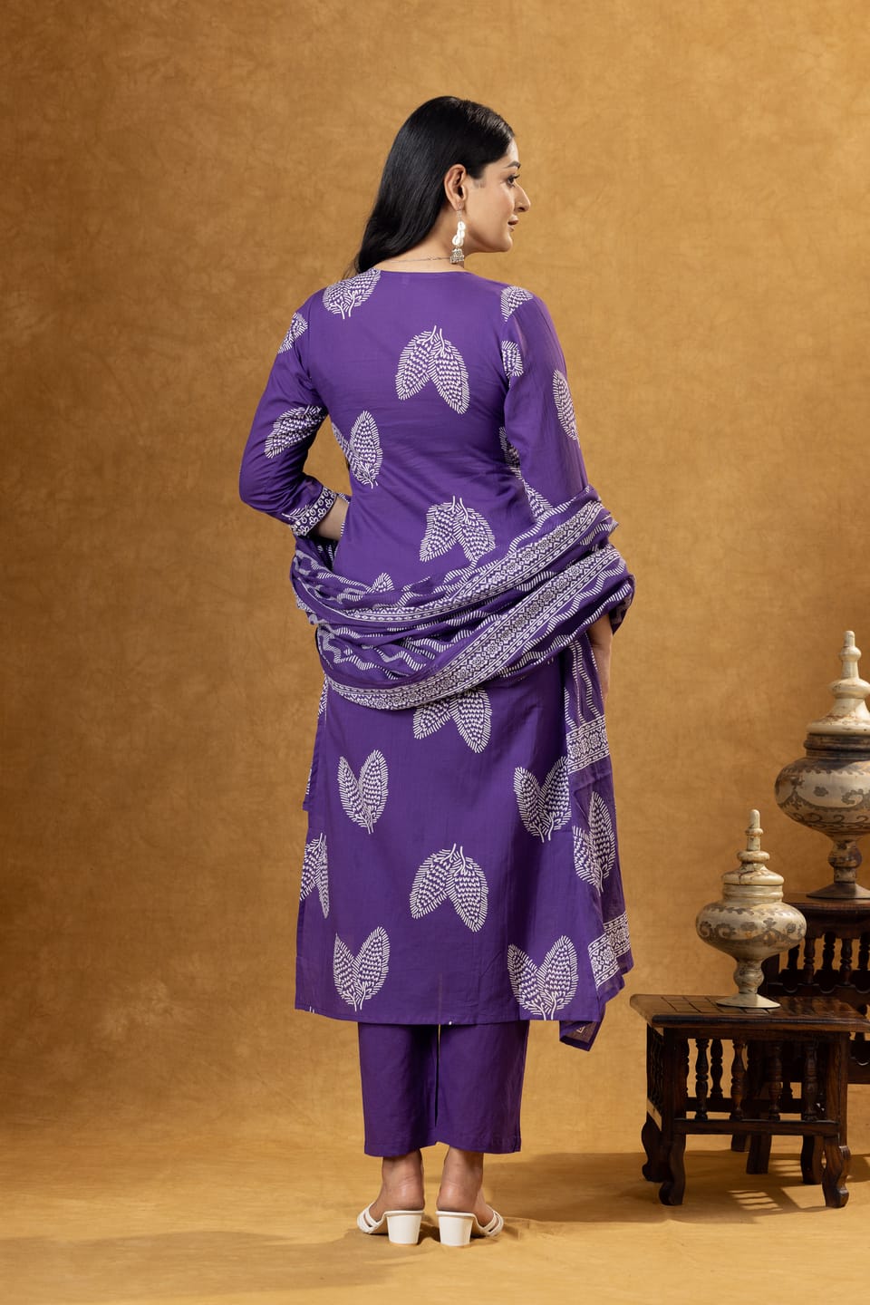 Elegant purple cotton kurta set featuring ethnic motifs print, comfortable palazzo pants, and a coordinated dupatta. Perfect for casual ethnic wear and everyday comfort.