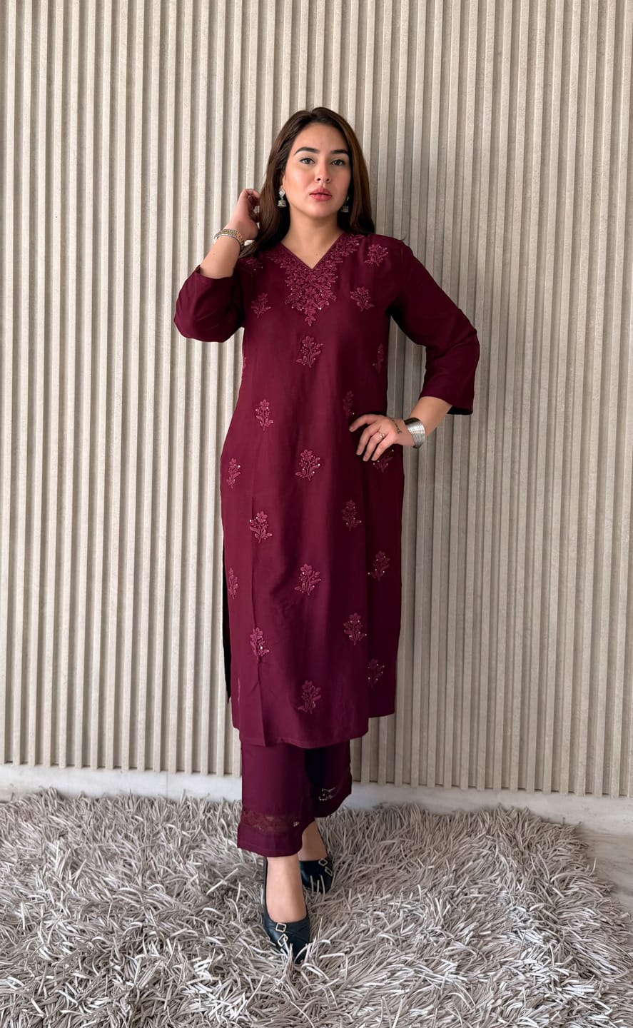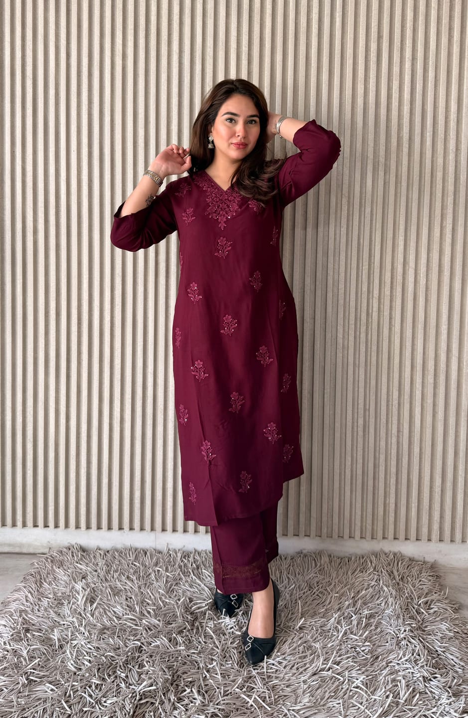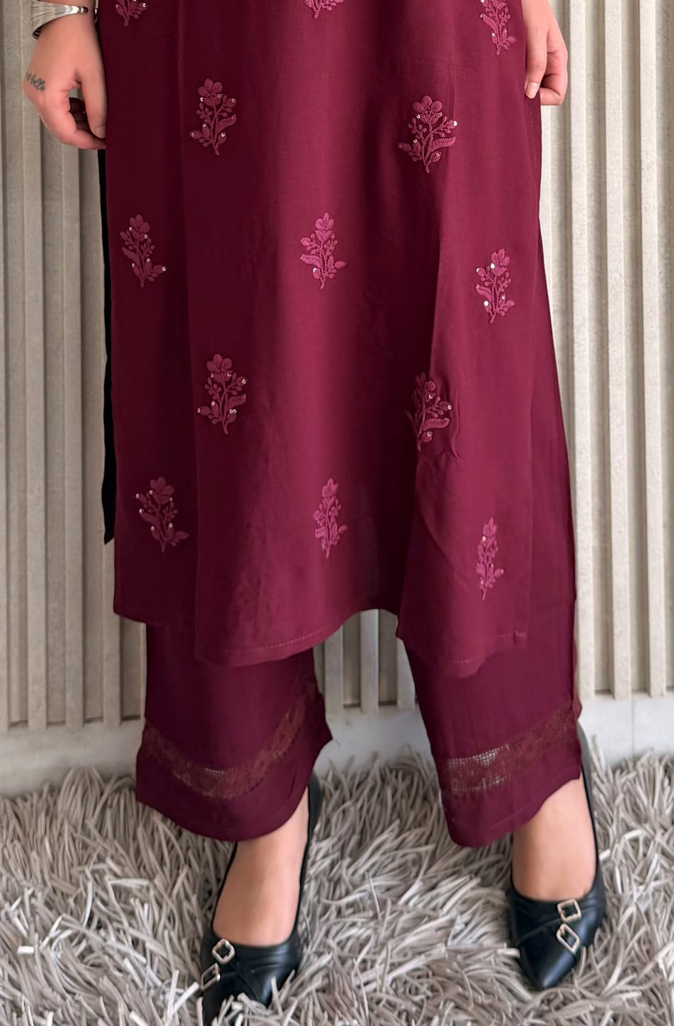 Maroon rayon straight kurta set with chikankari embroidery and palazzo pants. Comfortable ethnic wear for casual and daily use.