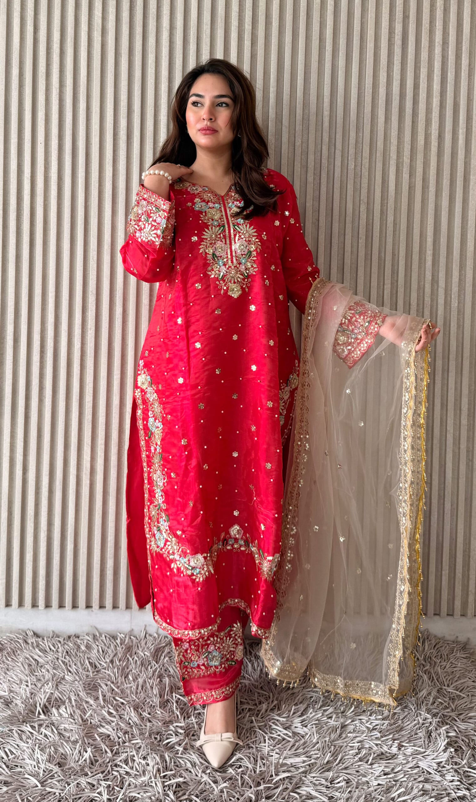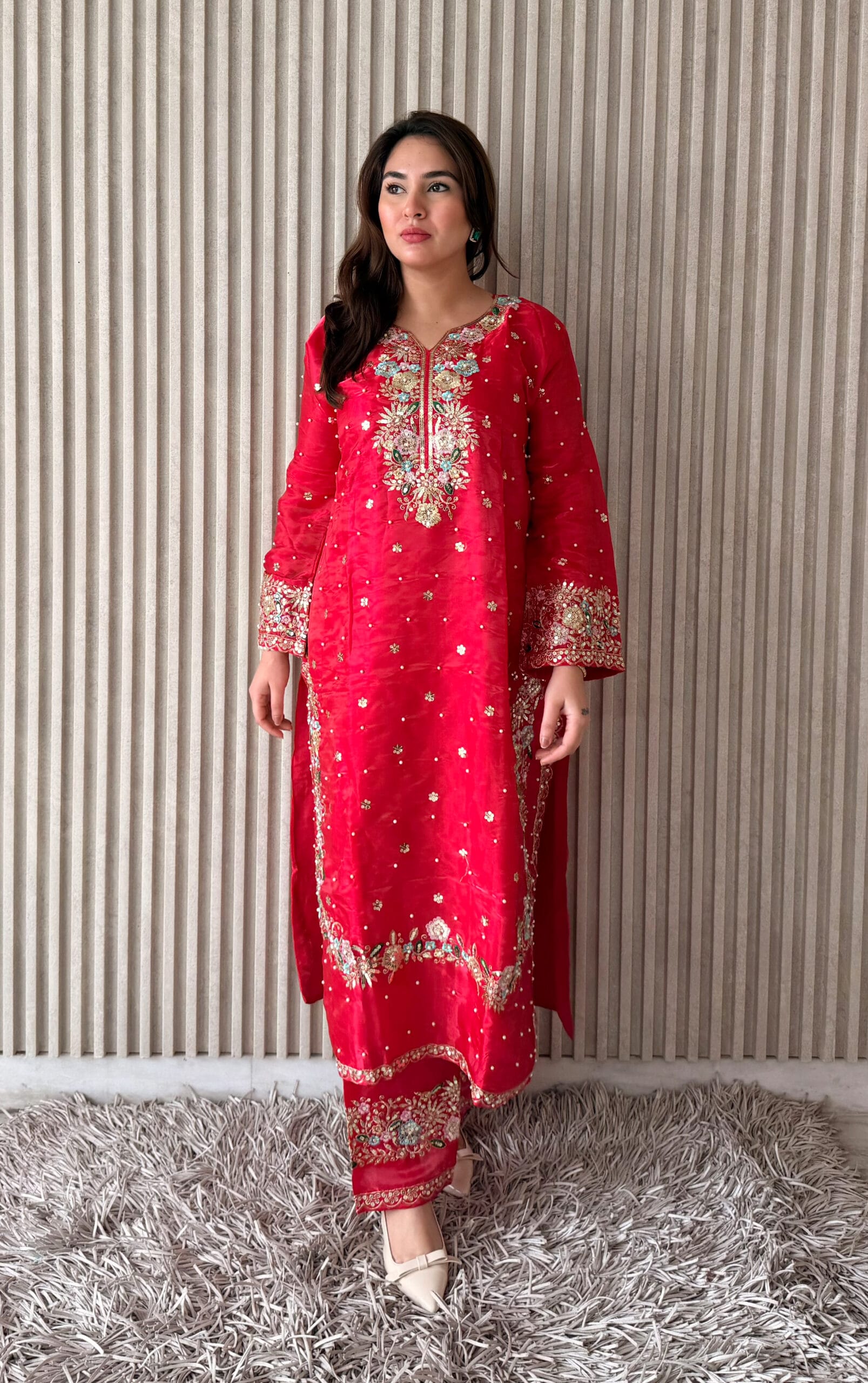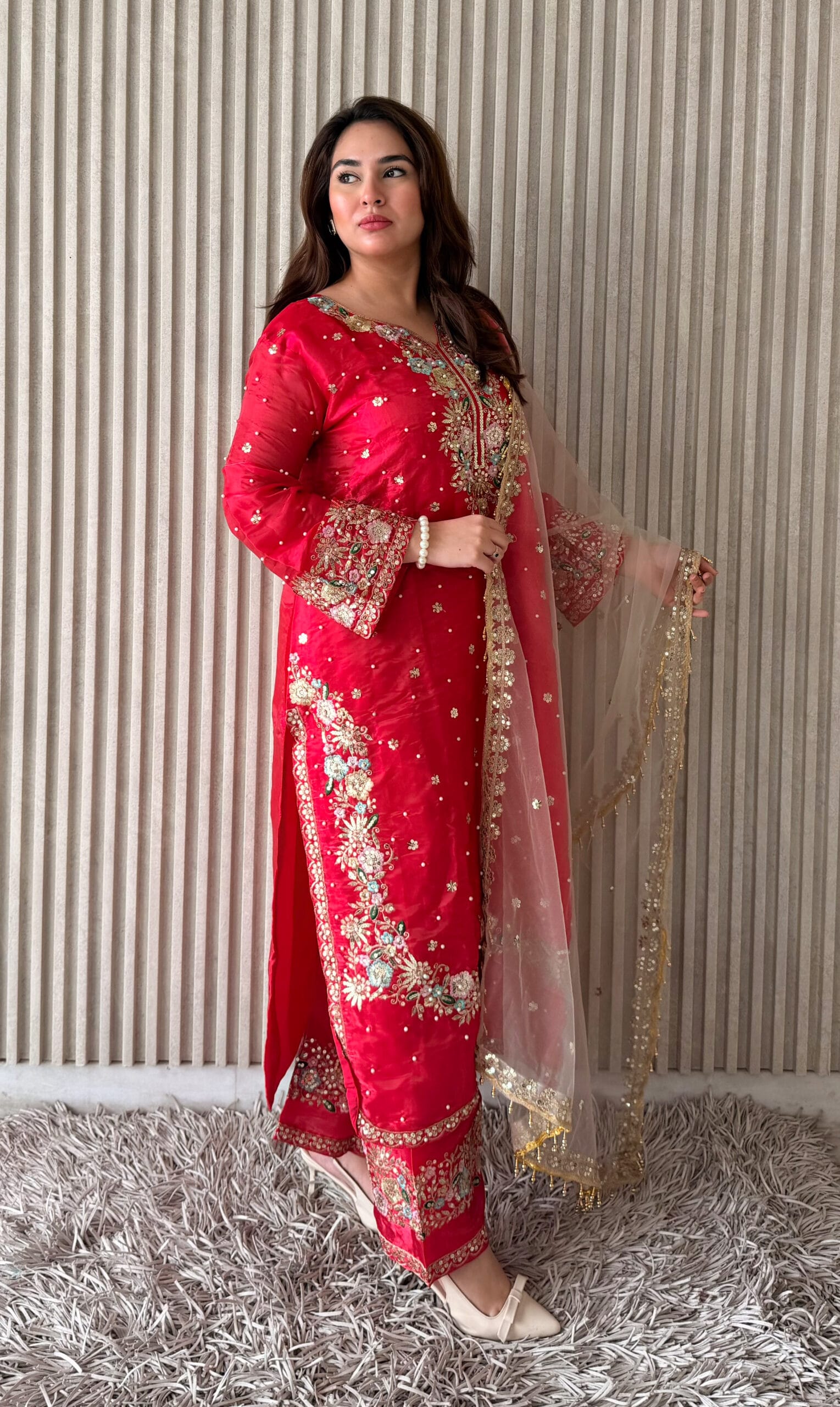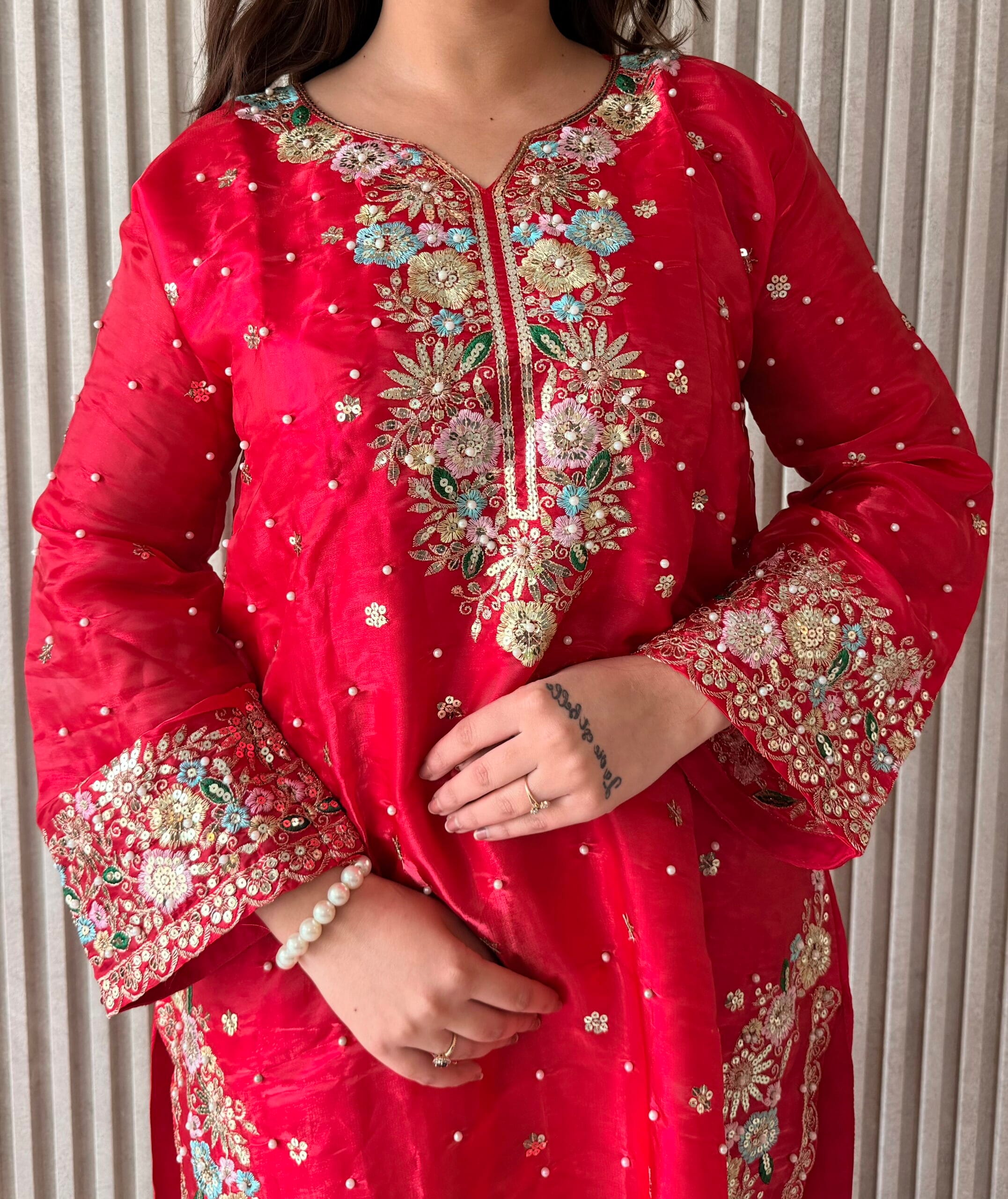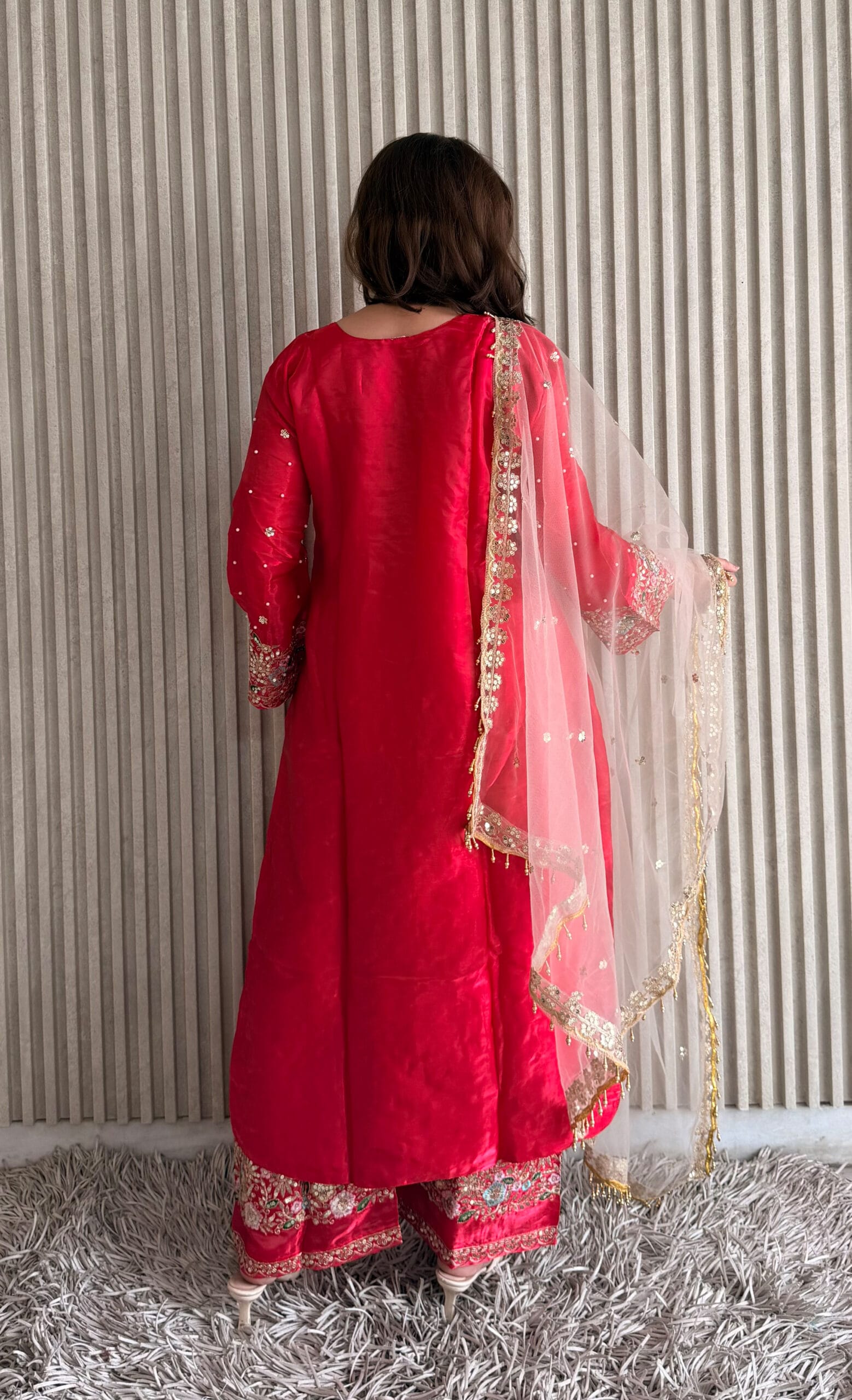 Elegant red straight kurta set with paisley embroidery and subtle sequins, paired with matching plazo and organza dupatta for festive occasions.
