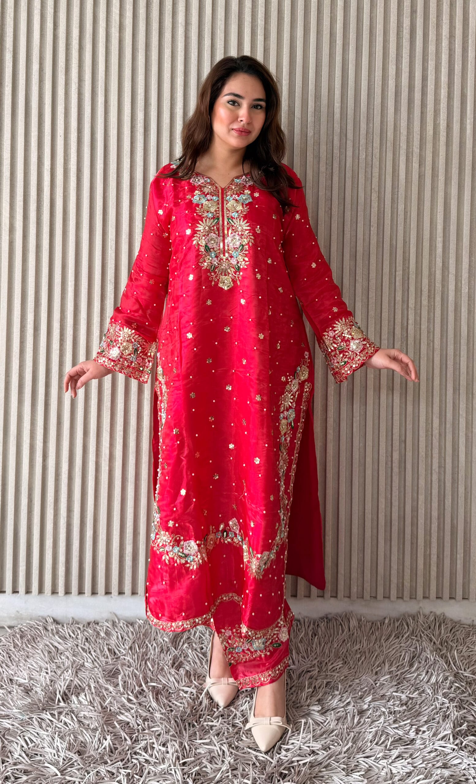 Designed with a flattering V-neckline and 3/4th sleeves, this red kurta set is ideal for festive celebrations, weddings, and party wear.
