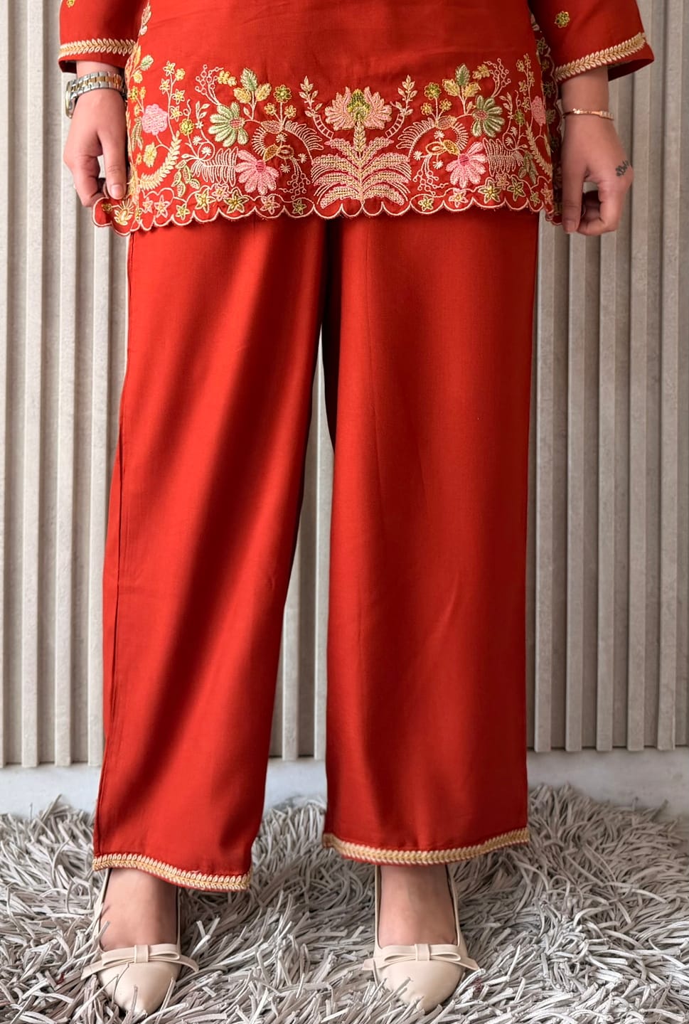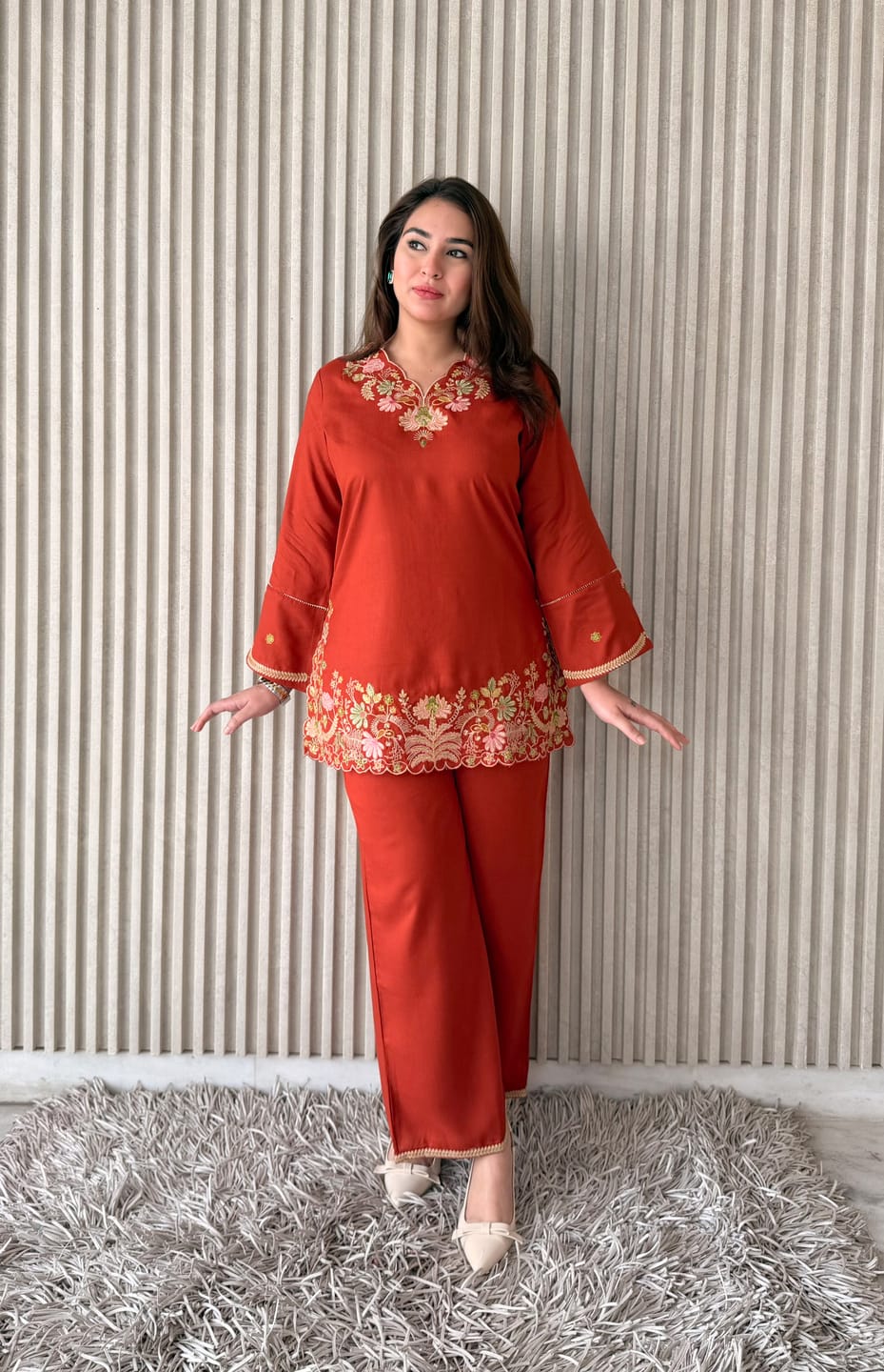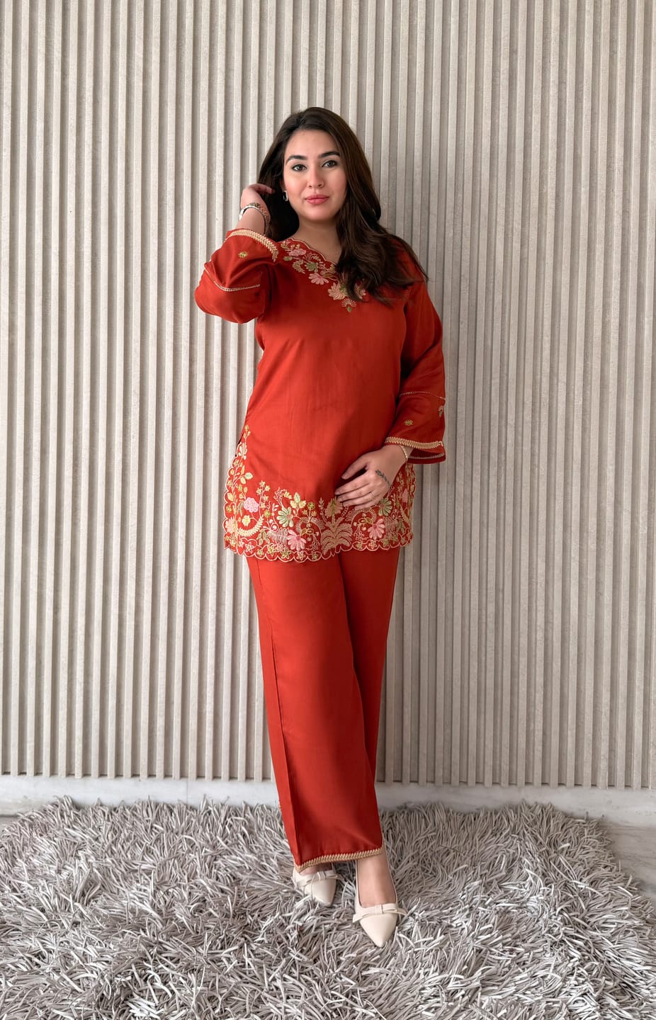 Rust pure rayon embroidered co-ord set featuring a straight kurta and matching pants. Elegant and comfortable ethnic wear for casual use.
