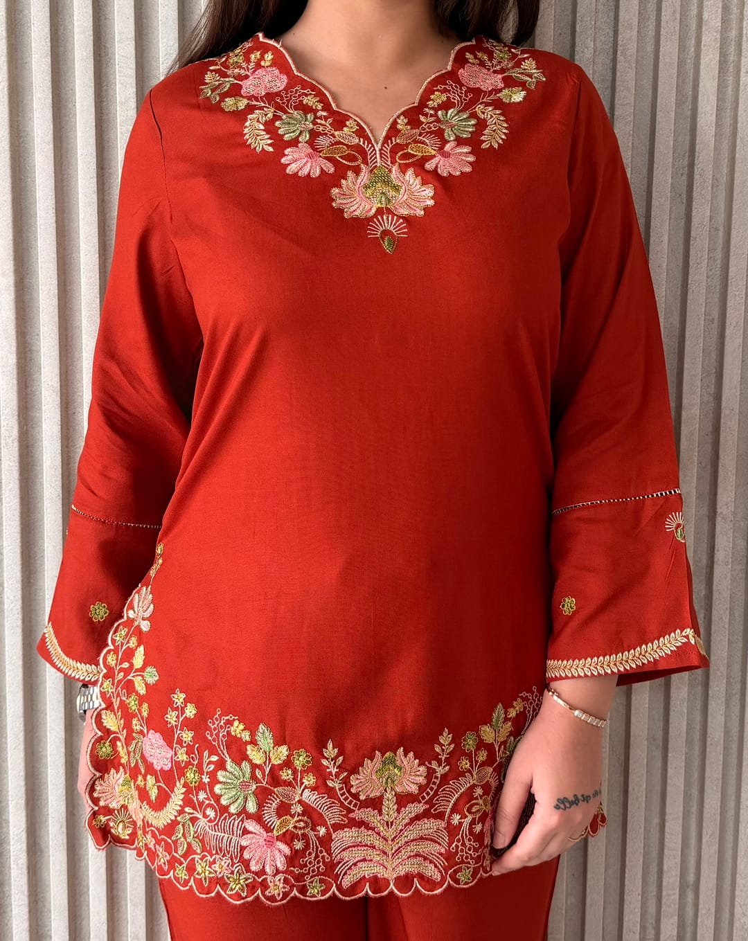Ideal for casual ethnic wear, festive daytime occasions, office wear, and family gatherings, this co-ord set blends timeless embroidery with modern comfort.