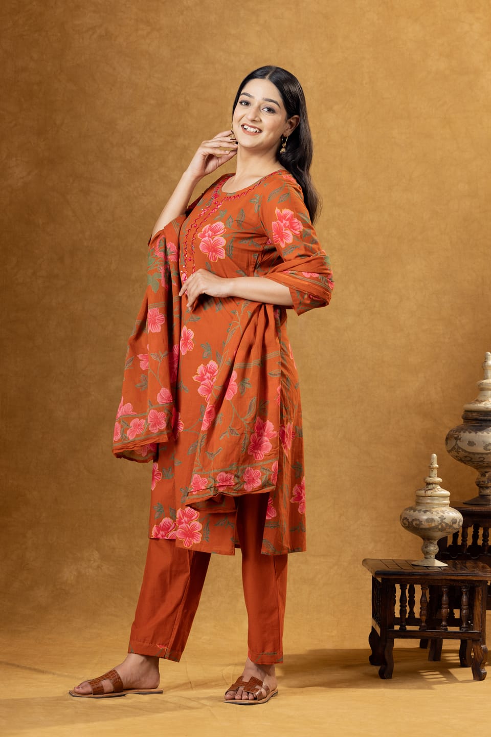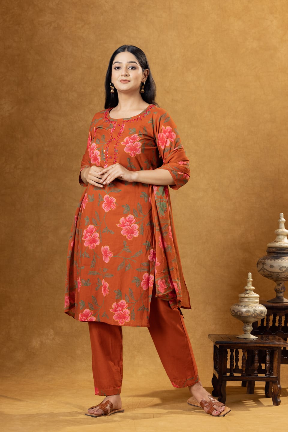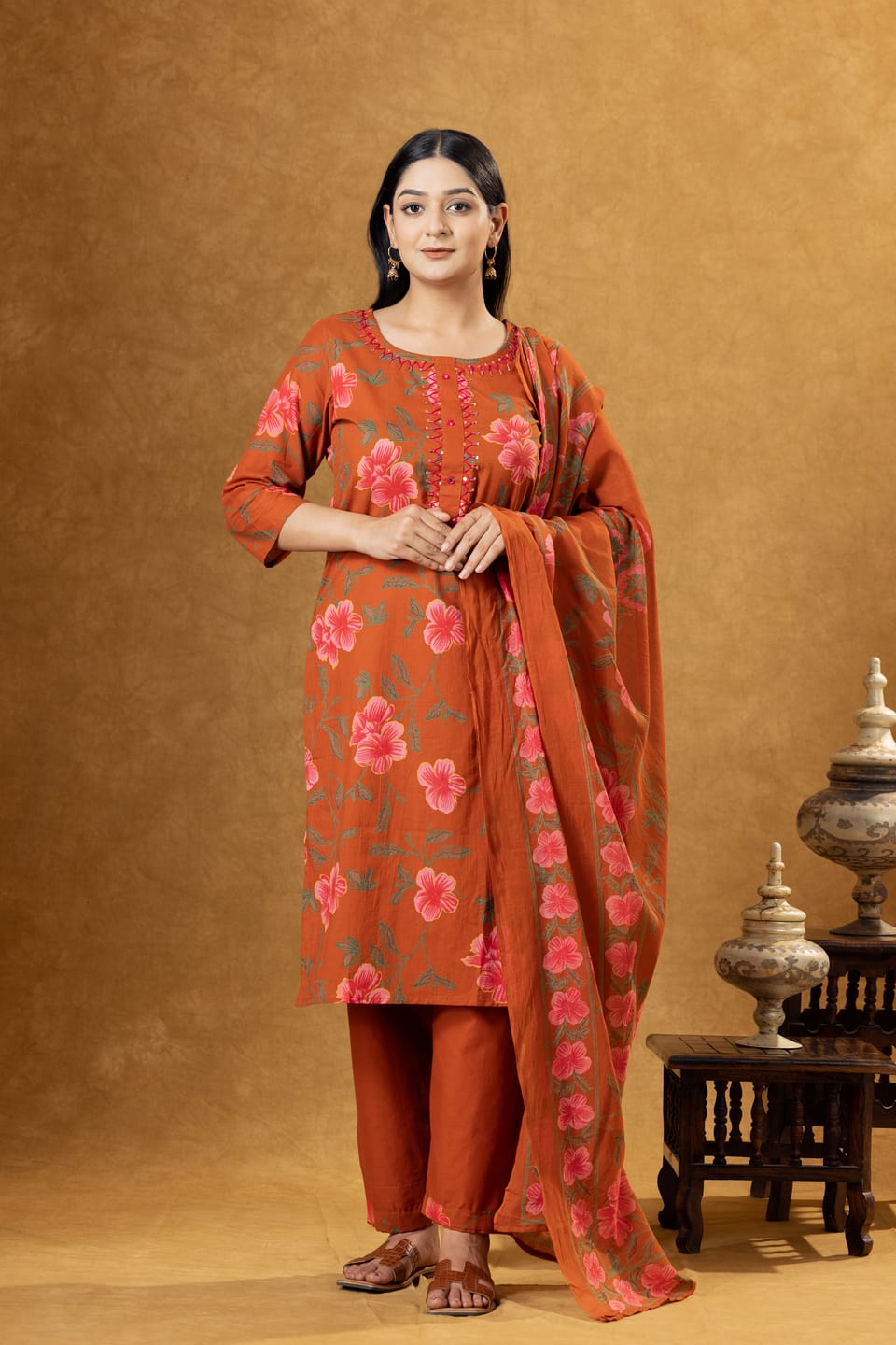 Stylish rust cotton kurta set featuring floral prints, comfortable palazzo pants, and a coordinated dupatta. Perfect for everyday ethnic wear and casual outings.