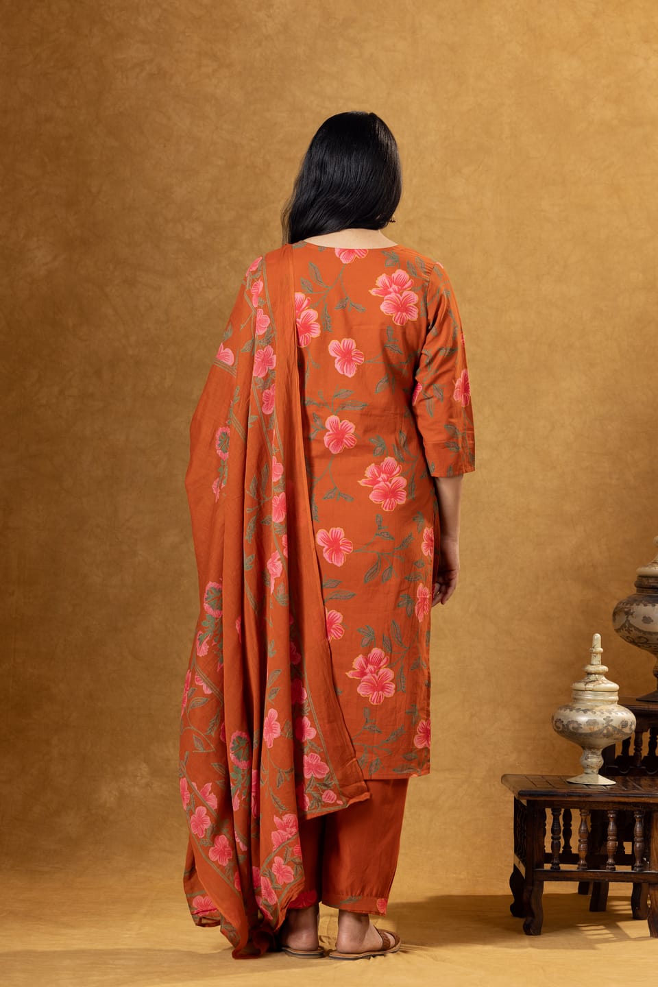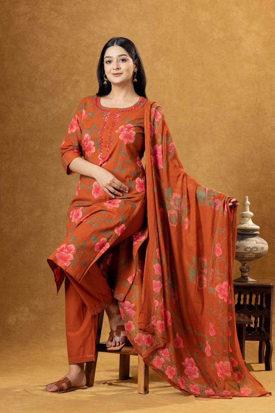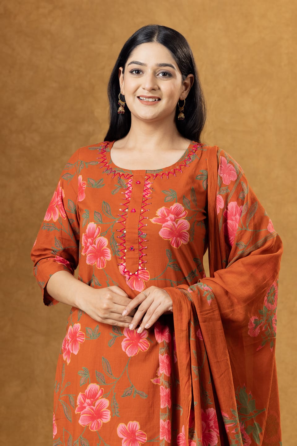 Stylish rust cotton kurta set featuring floral prints, comfortable palazzo pants, and a coordinated dupatta. Perfect for everyday ethnic wear and casual outings.