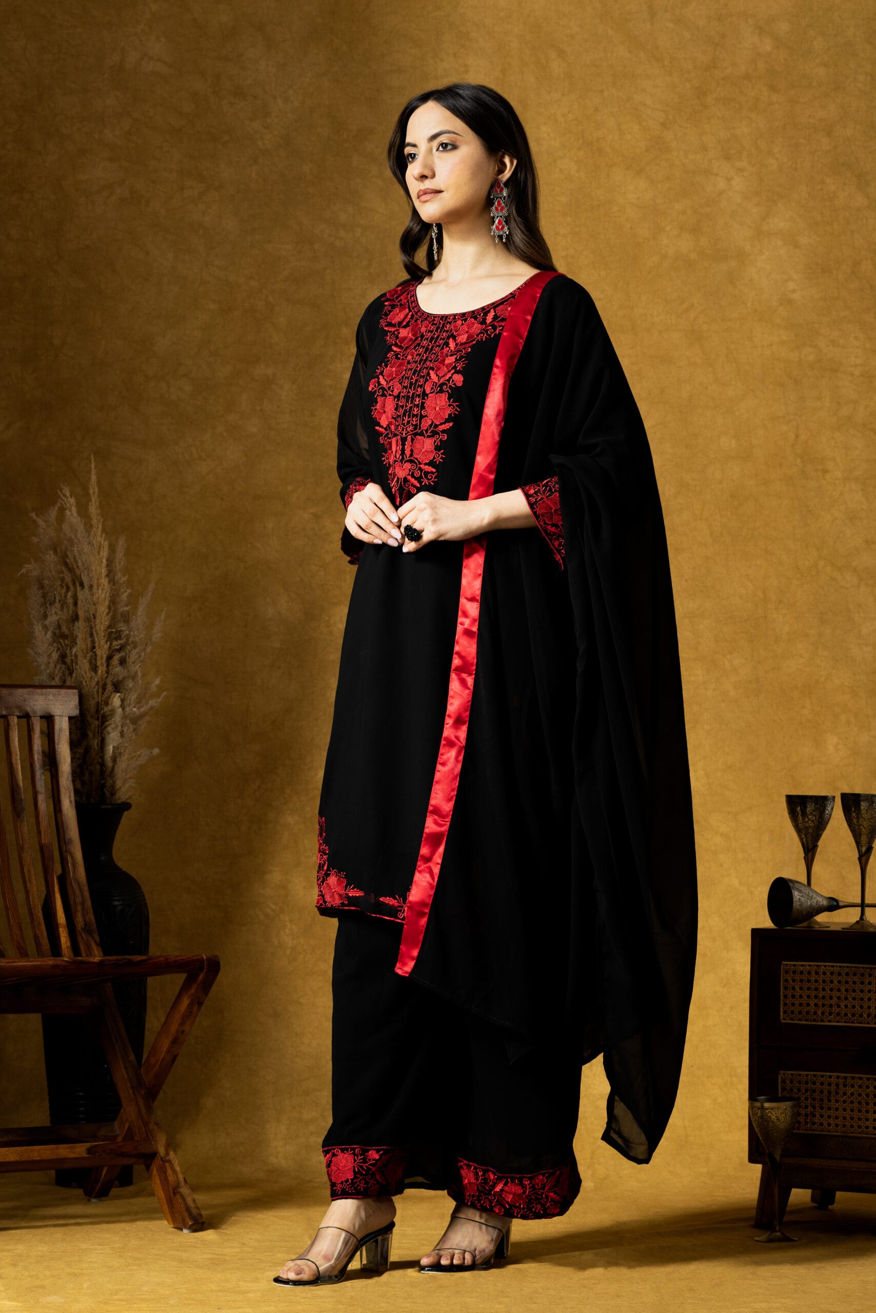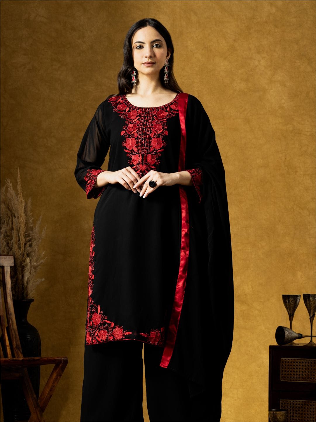 Elegant black georgette kurta plazo set with rich red embroidery and a flowy embroidered dupatta—perfect for graceful everyday ethnic wear.