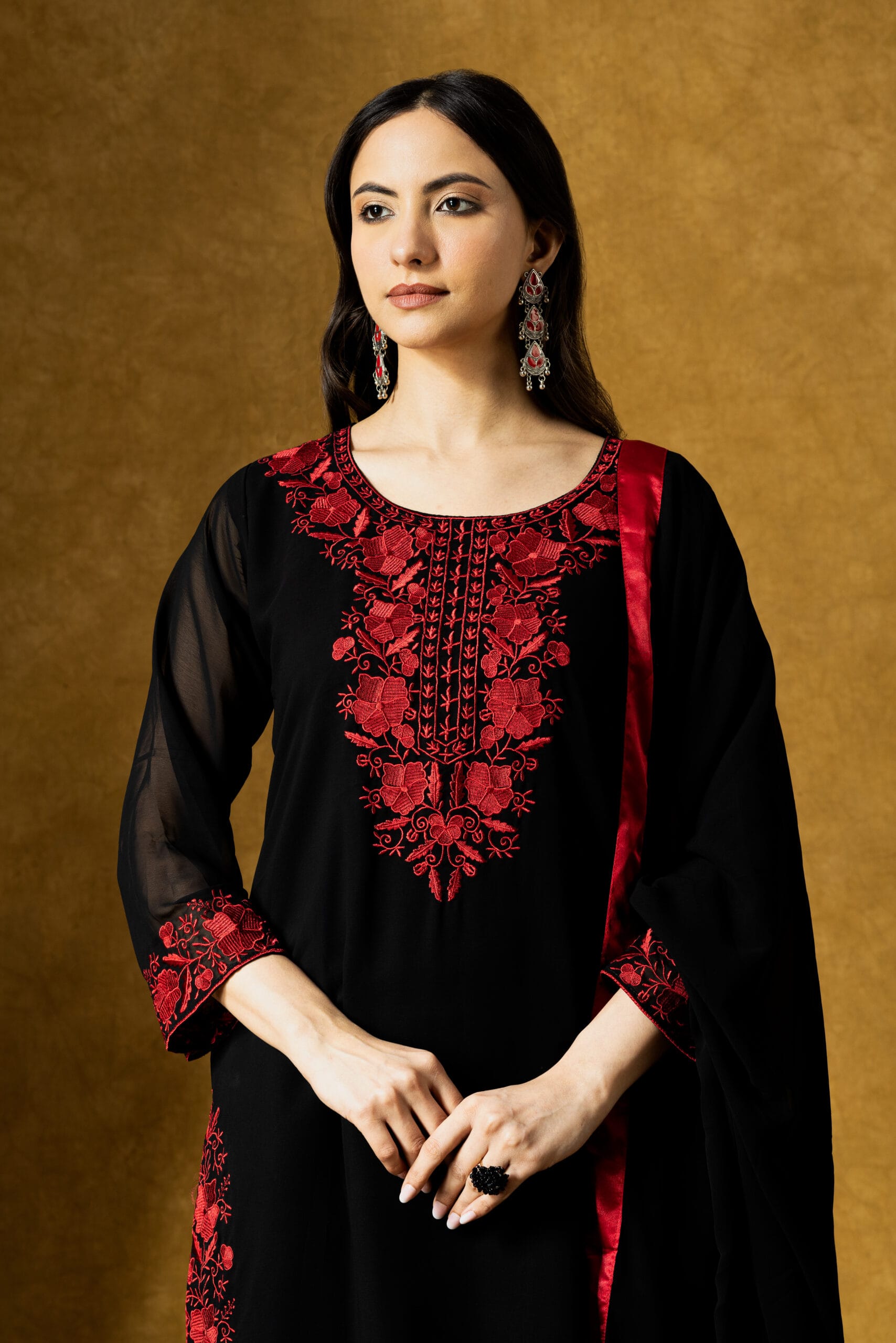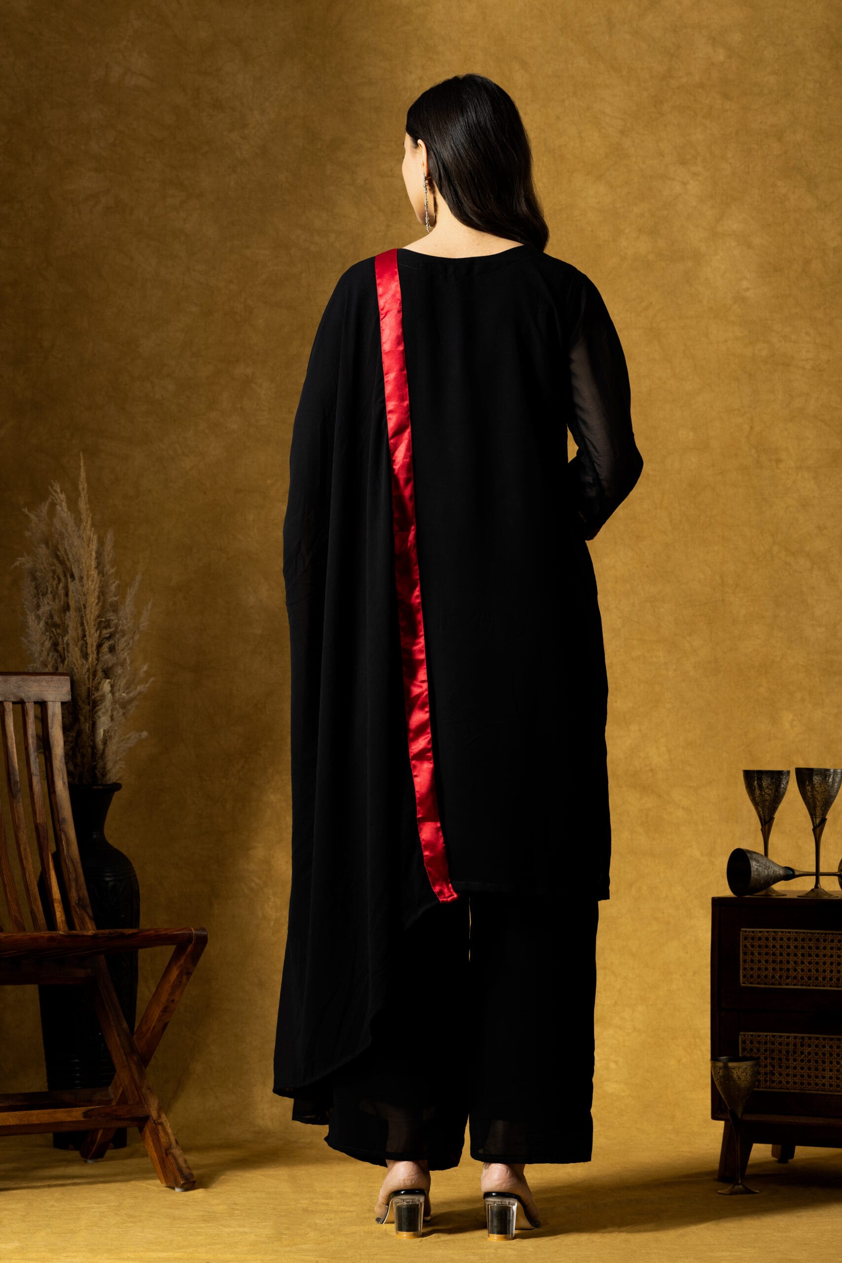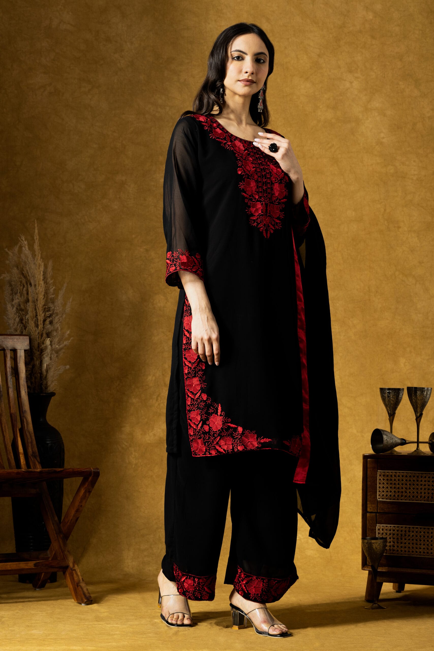The straight-fit, calf-length kurta features intricate red embroidery that beautifully contrasts with the deep black base, adding a refined ethnic charm. It is paired with a comfortable georgette plazo, ensuring ease of movement and a flattering silhouette. The look is completed with a delicate embroidered georgette dupatta, adding elegance and fluidity.