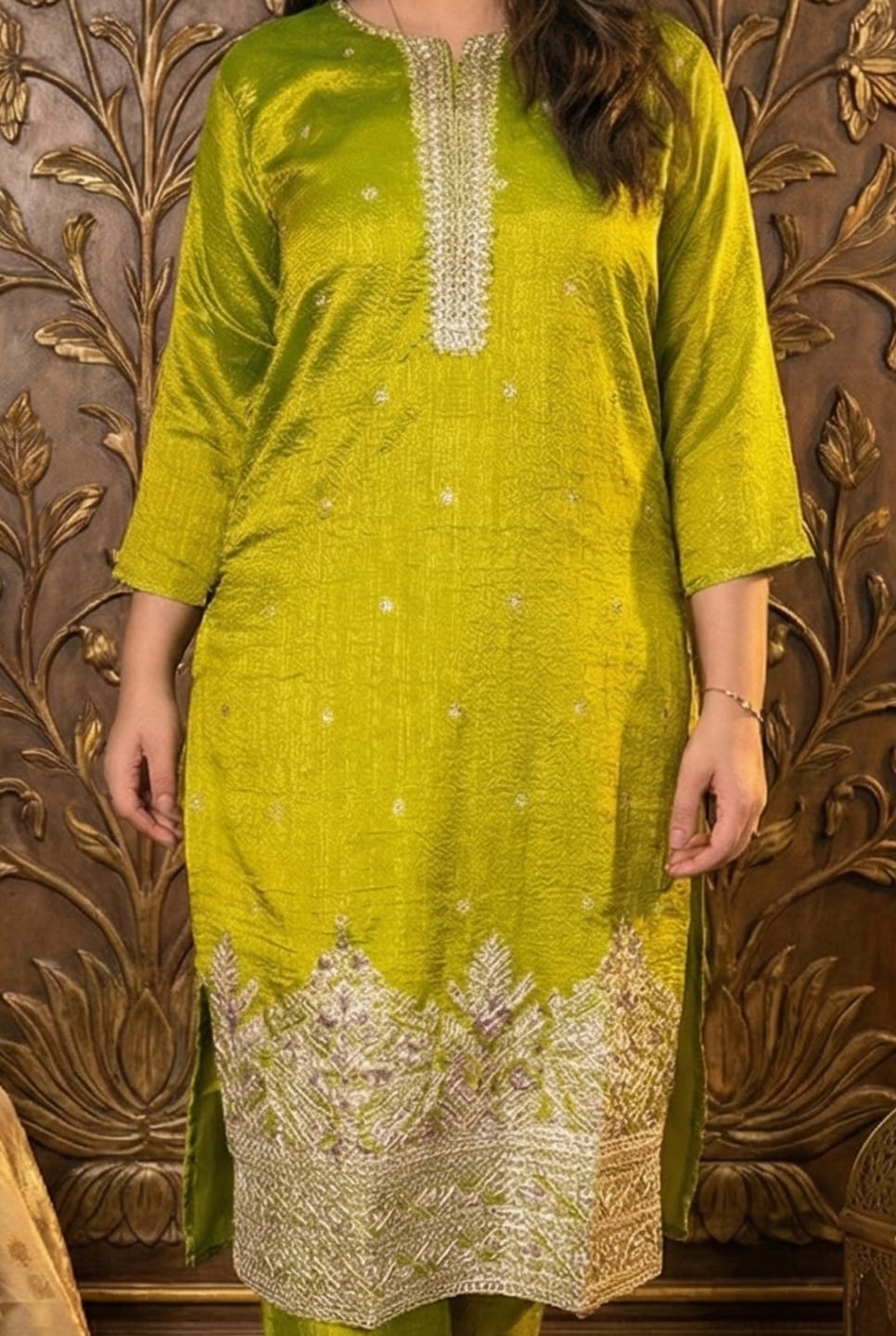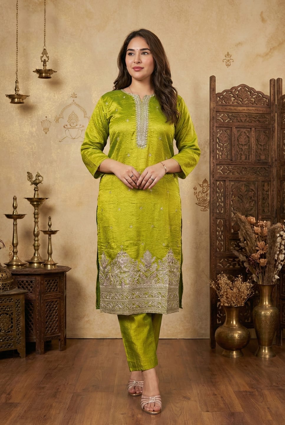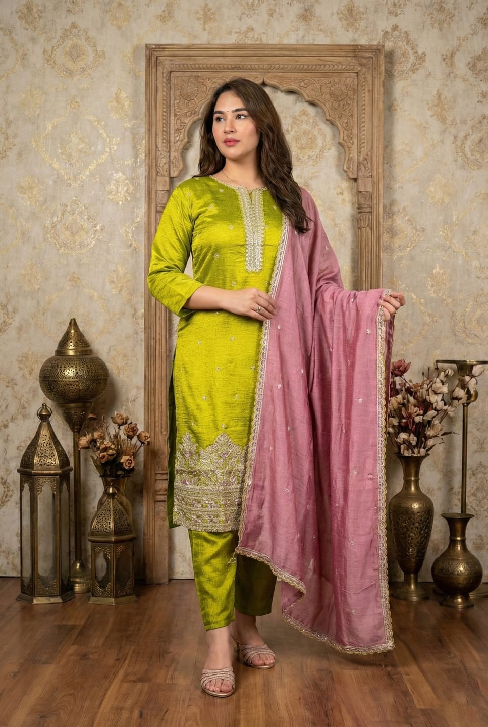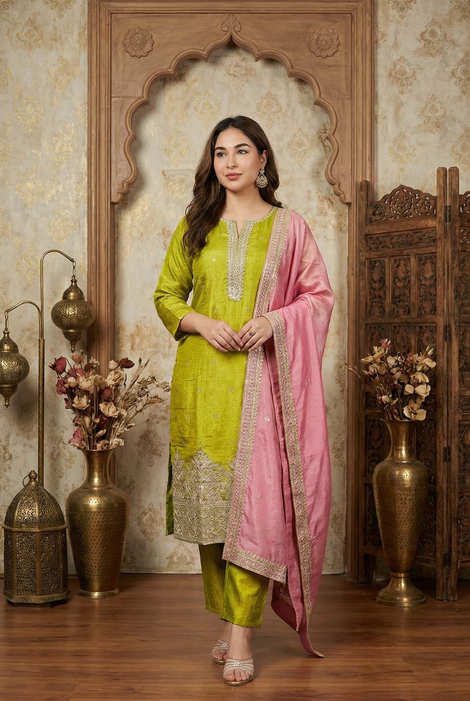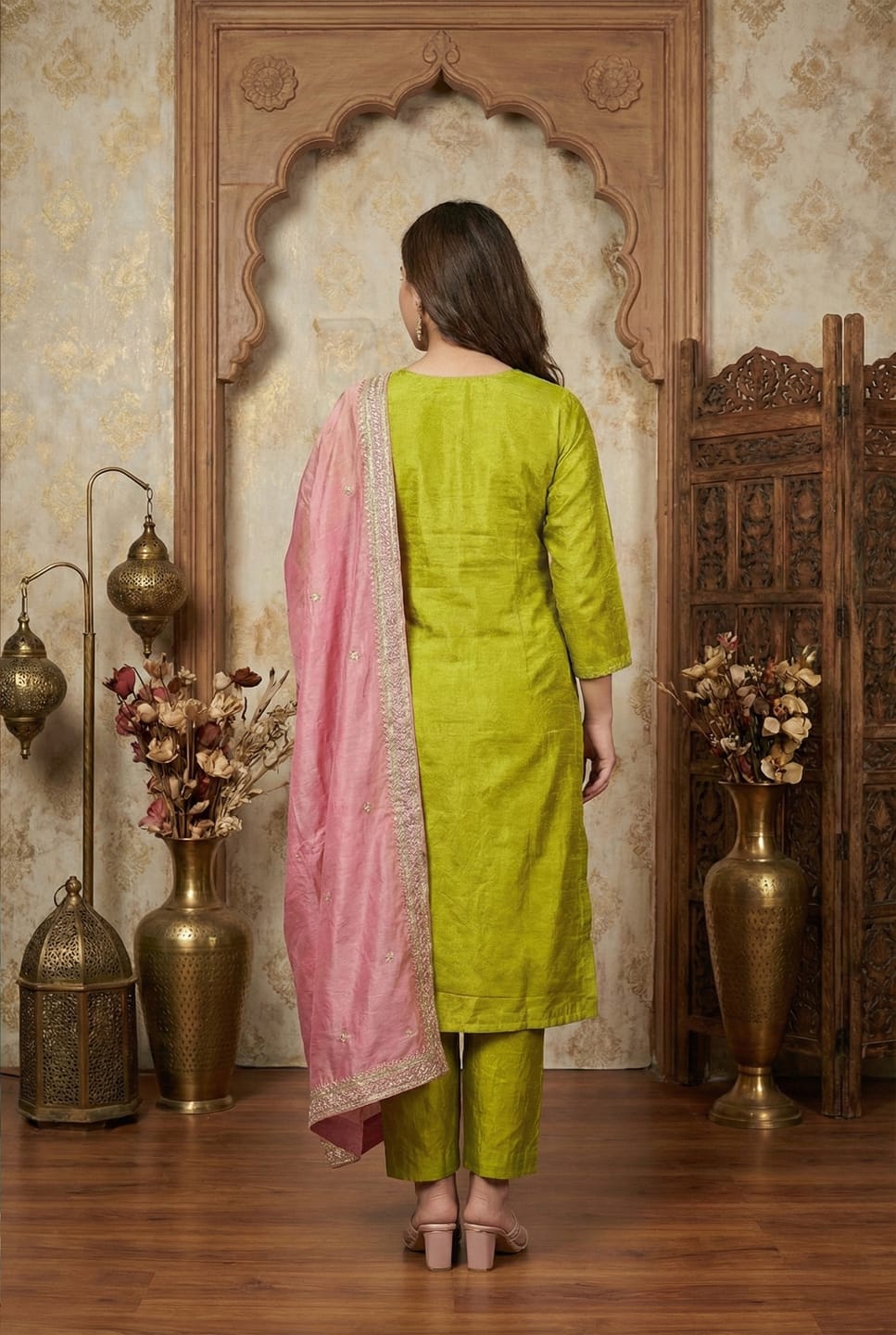 Step into festive elegance with this Label By Anusha ethnic kurta set. Crafted in premium silk blend fabric, this straight-fit green kurta features delicate ethnic embroidery, paired with matching trousers and a beautifully coordinated pink dupatta.