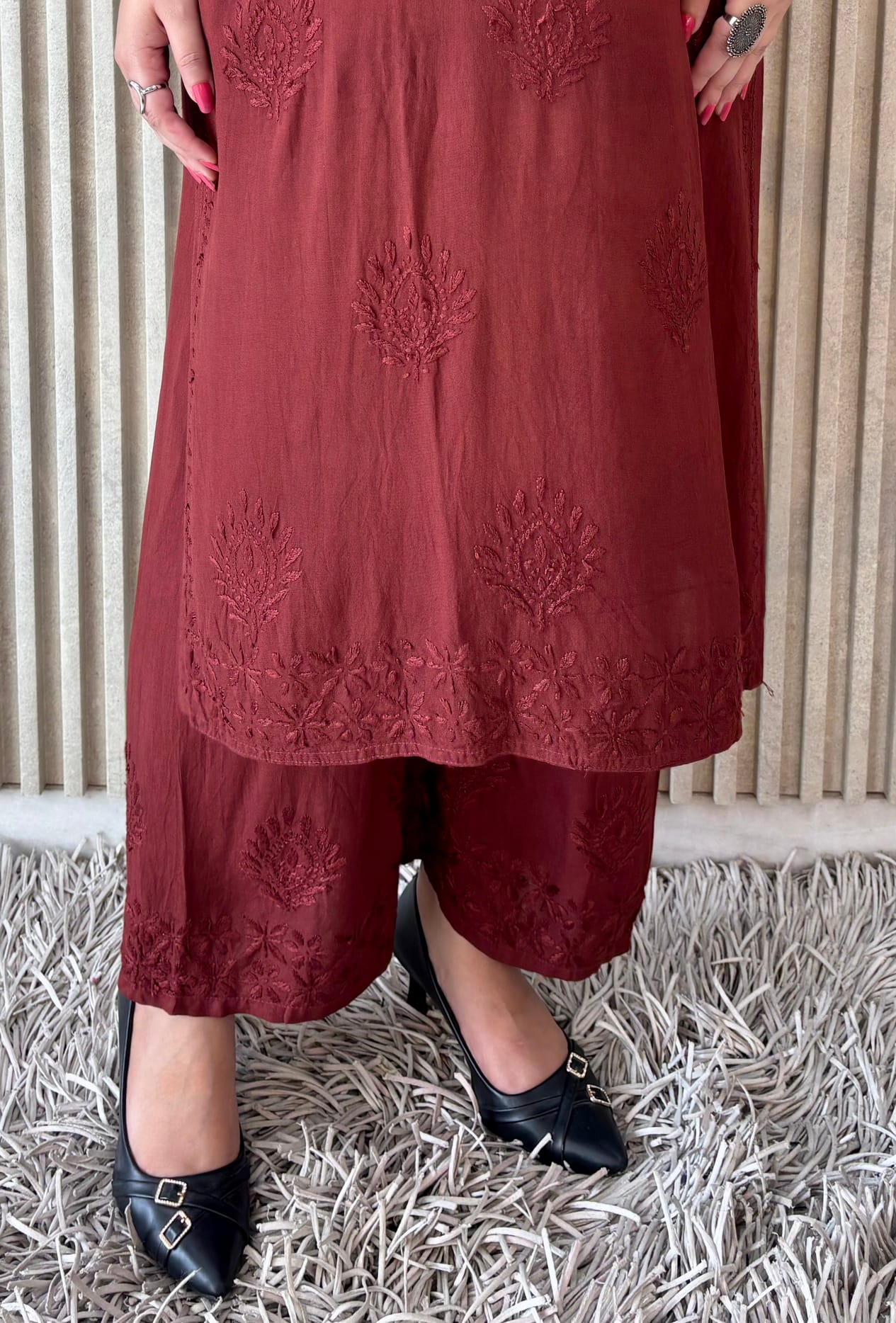 Redefine elegance with this maroon Chikankari kurta set by Label by Anusha. Crafted from premium rayon fabric, the straight-cut calf-length kurta features delicate ethnic motifs embroidery, a V-neckline, and 3/4 sleeves for effortless sophistication. Paired with matching palazzo pants, this ensemble blends Lucknow’s timeless hand embroidery with modern comfort—perfect for casual outings, festive gatherings, and traditional occasions.