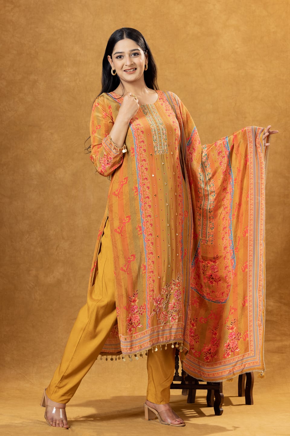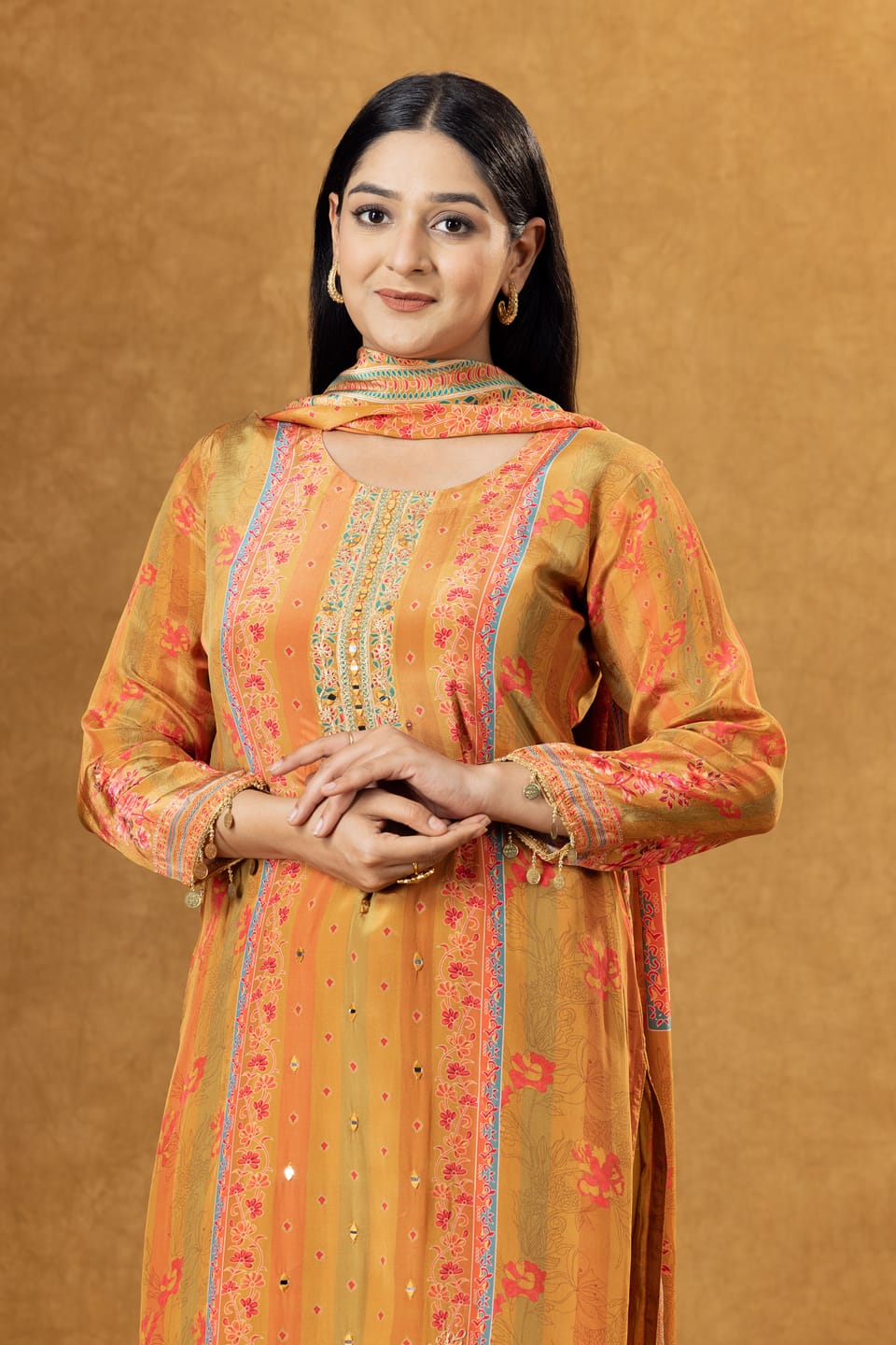 Elegant yellow muslin kurta set featuring floral prints, comfortable trousers, and a matching dupatta. Lightweight, breathable, and perfect for casual ethnic wear.
