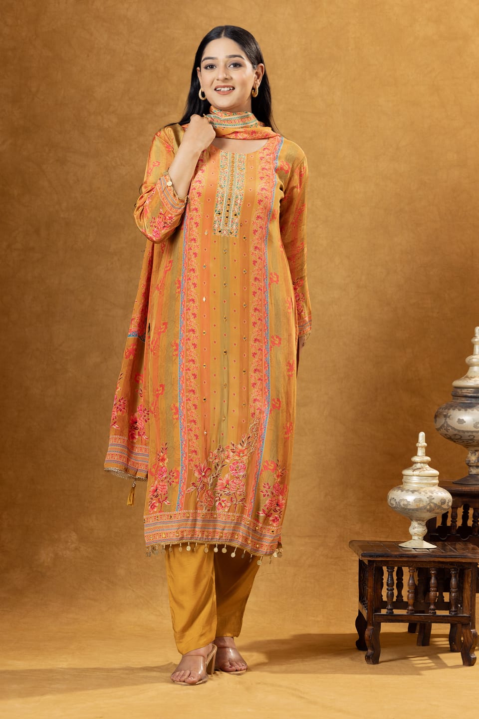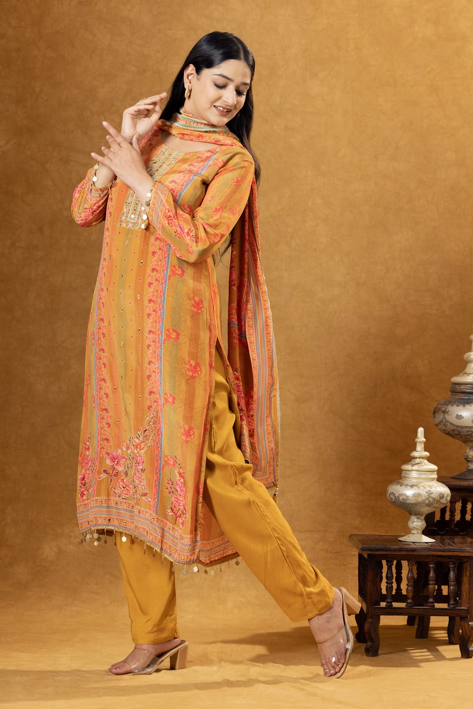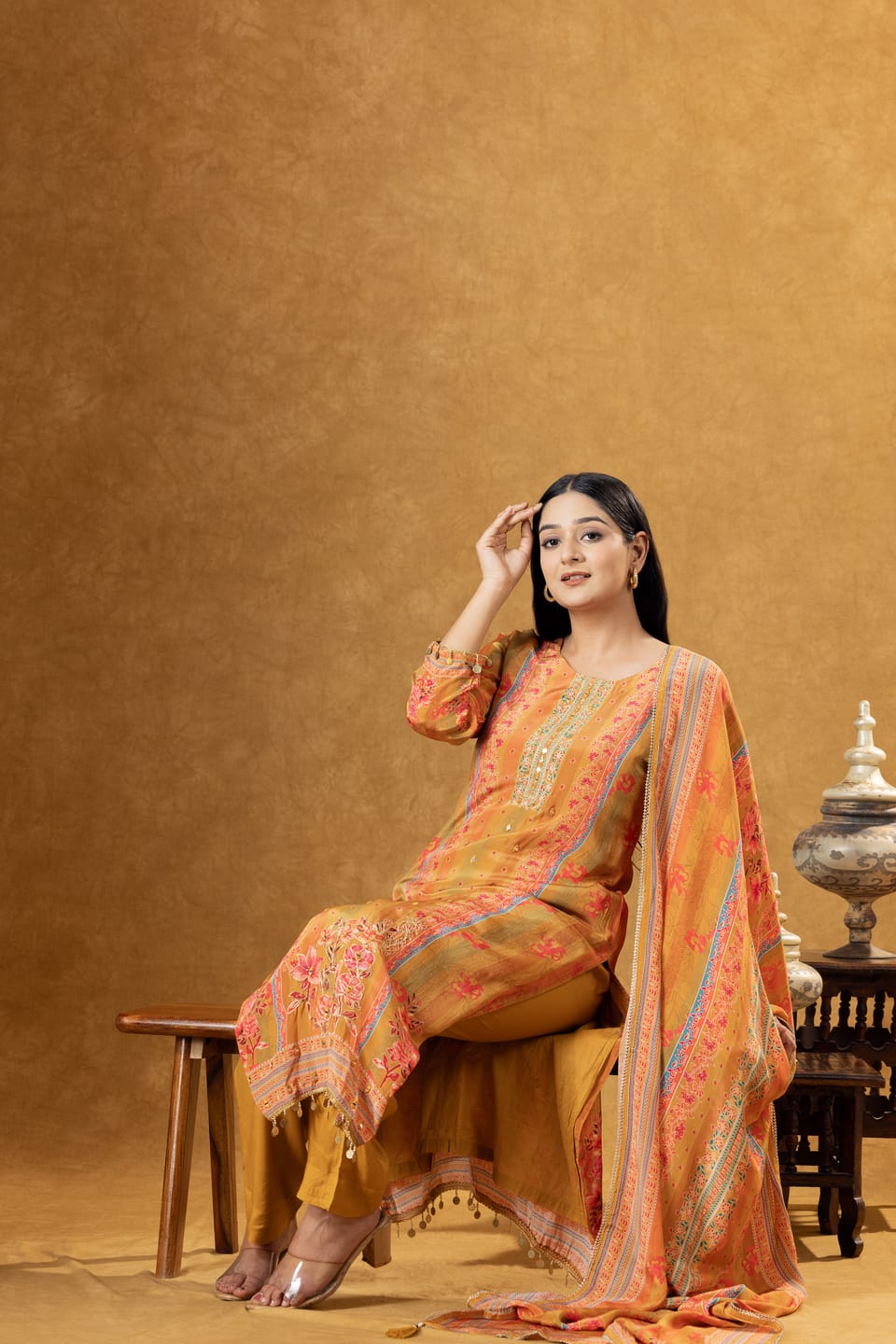 The straight-cut calf-length kurta features delicate floral prints that enhance its traditional appeal while maintaining a modern aesthetic. Paired with comfortable muslin trousers and a beautifully coordinated dupatta, this set creates a balanced and sophisticated ethnic look.