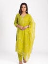 Made from breathable, soft muslin crepe, the kurta features a flowy A-line silhouette designed to flatter every body type. Itโs enriched with intricate hand embroidery and subtle patchwork prints, creating a beautiful fusion of heritage and contemporary fashion. The set is paired with coordinating pants and a matching dupatta that adds a graceful finish to the look.